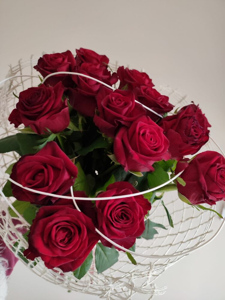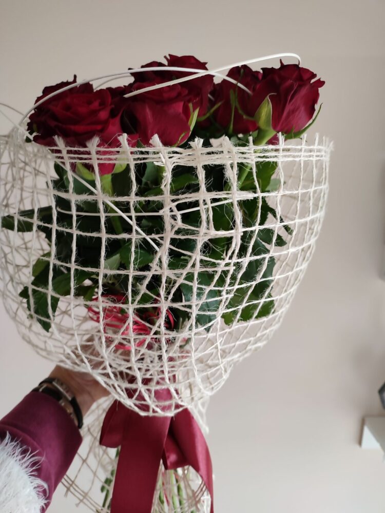Bukiet z 15 dużych , czerwonych róż z przybraniem. Róże długości 60 cm.