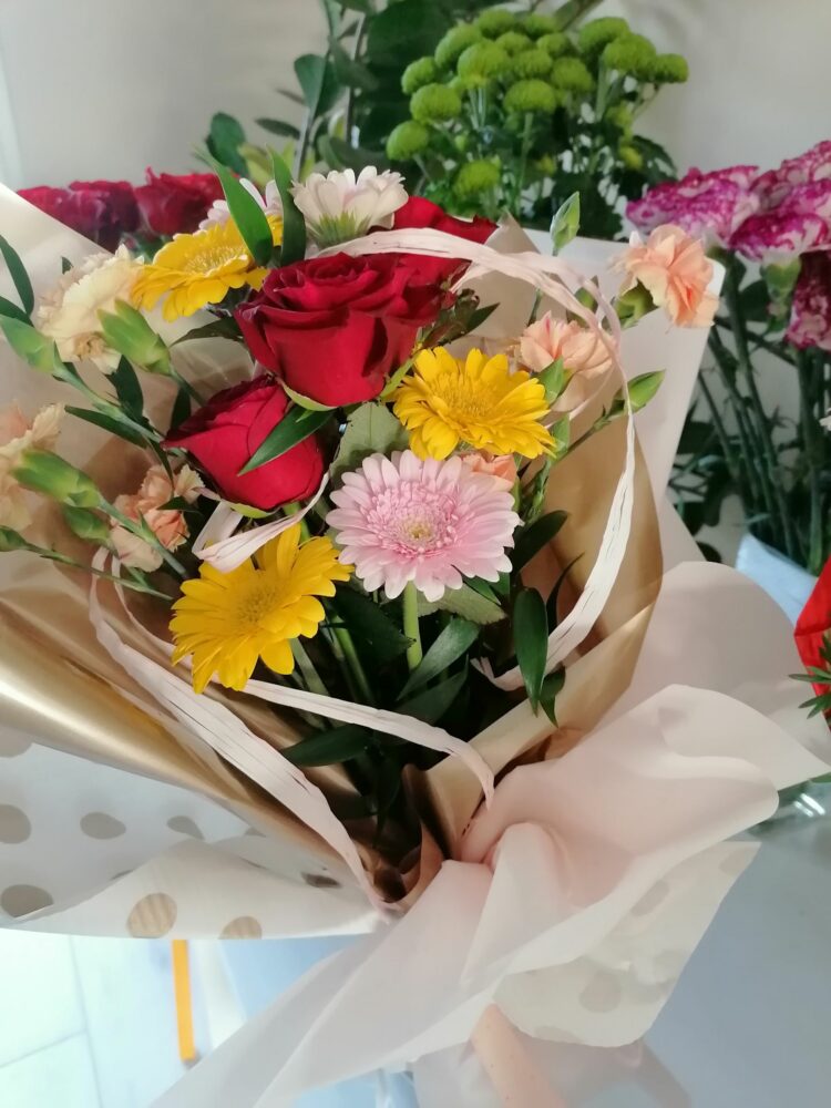 Bukiet z kwiatów naturalnych: róże, goździki, gerbery.