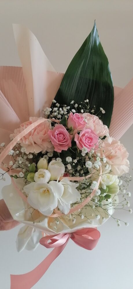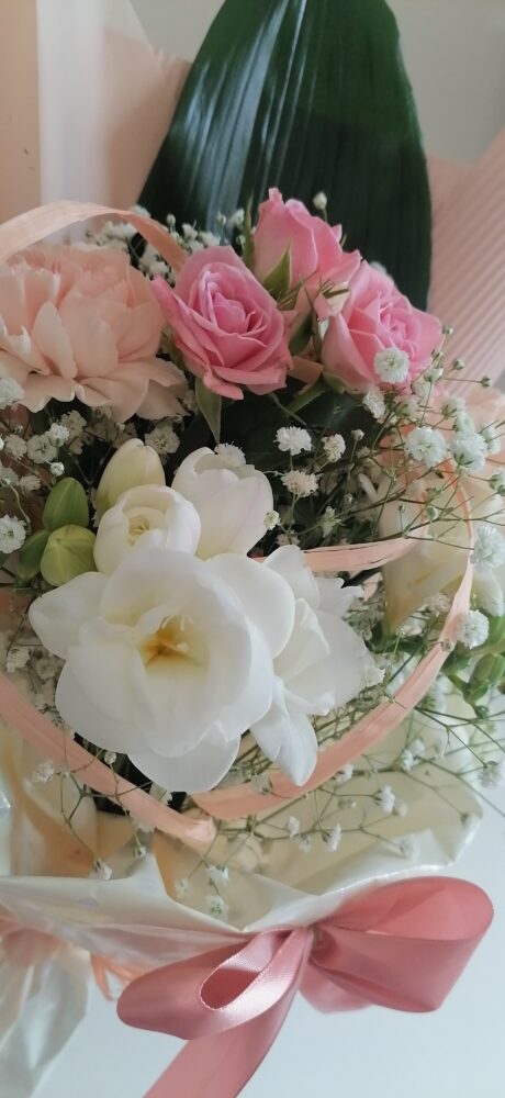 Bukiet z róż, goździków, frezji i gipsówki/naturalny