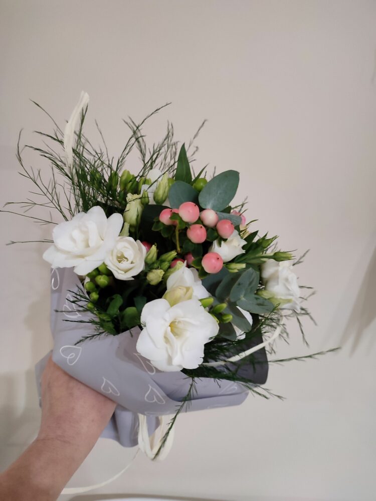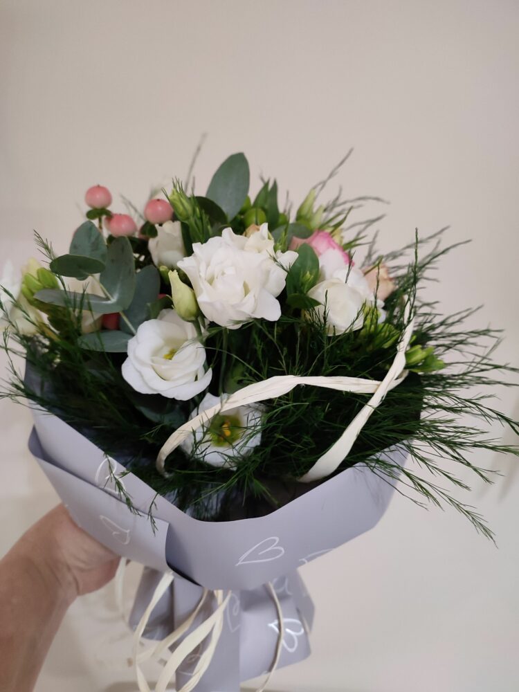 Bukiet mieszany/róża, eustoma, kawa, eukaliptus, tiki/naturalny