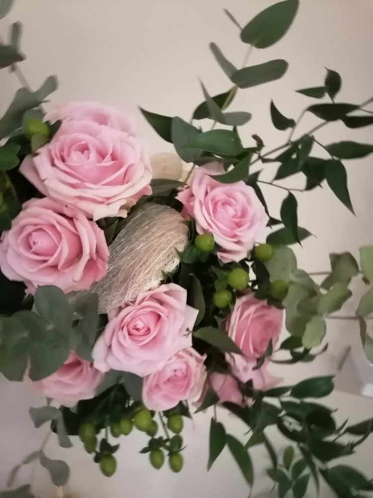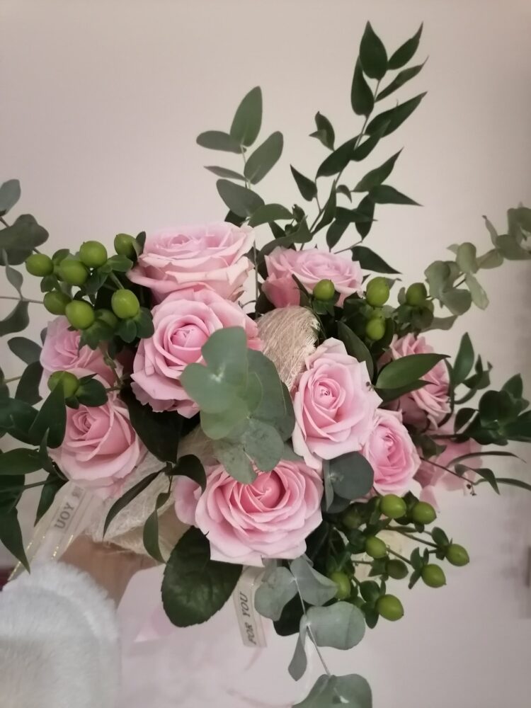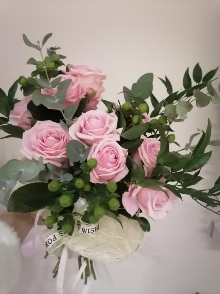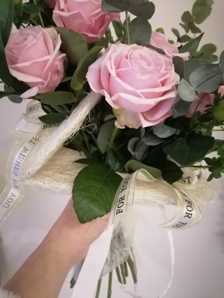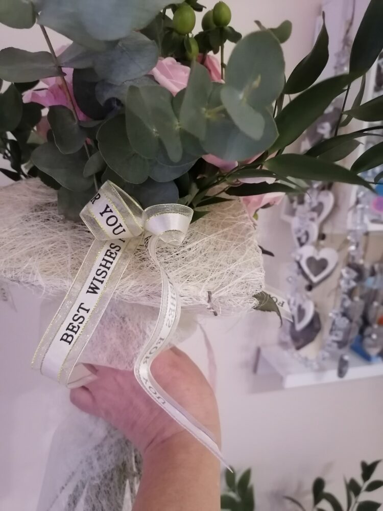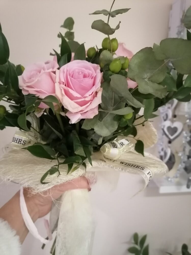 Bukiet naturalny z róż, kawy i eukaliptusa, umieszczony w kryzie z dwóch serc .Na żywo prezentuje się tak, jakby kwiaty „wychodziły” z otwartego serca.