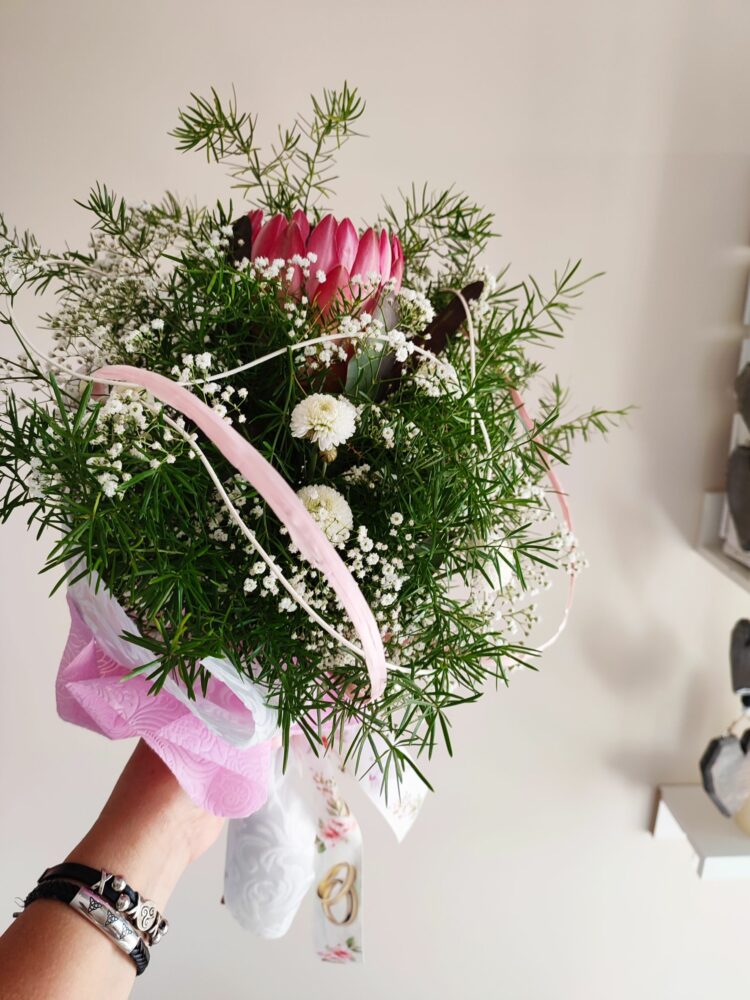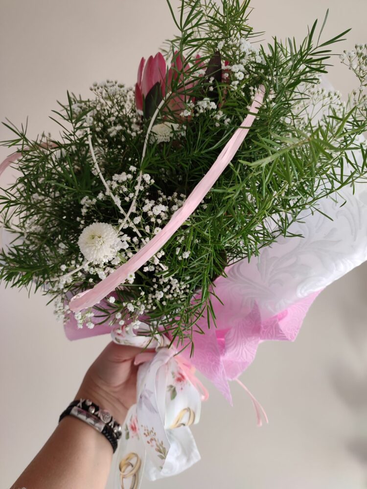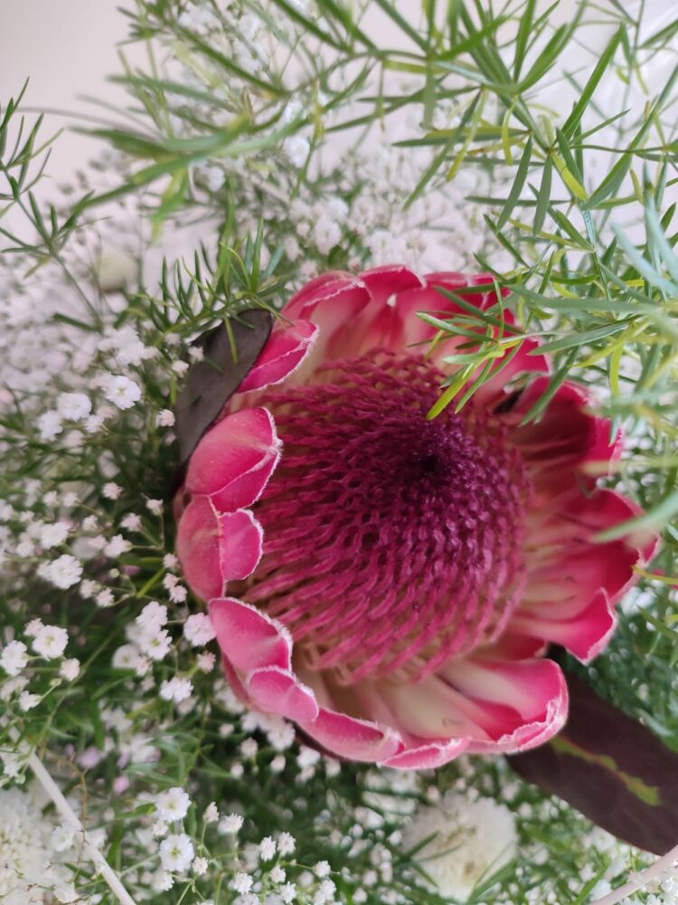Protea z zielonymi dodatkami( asparagusem) , margerytkami i gipsówką (wszystko naturalne).