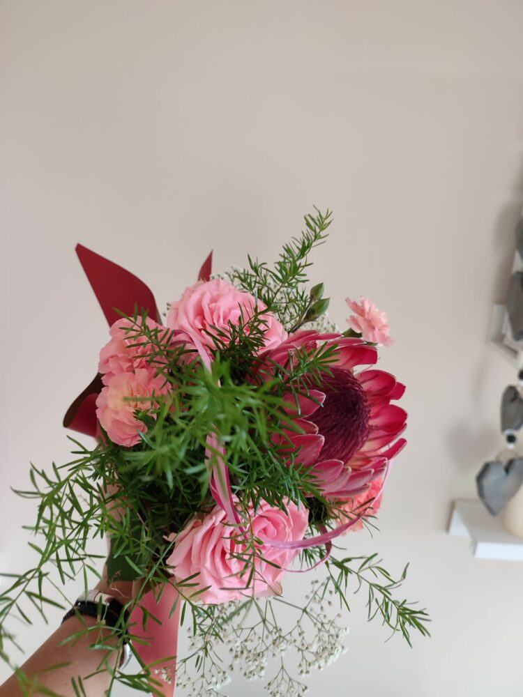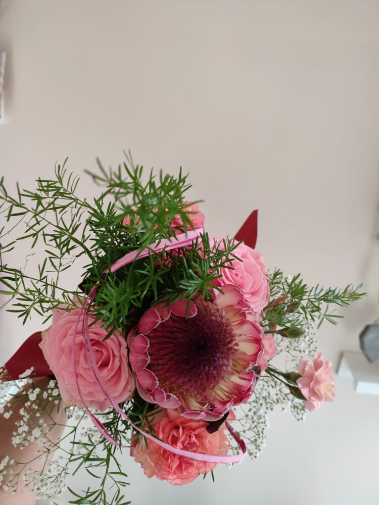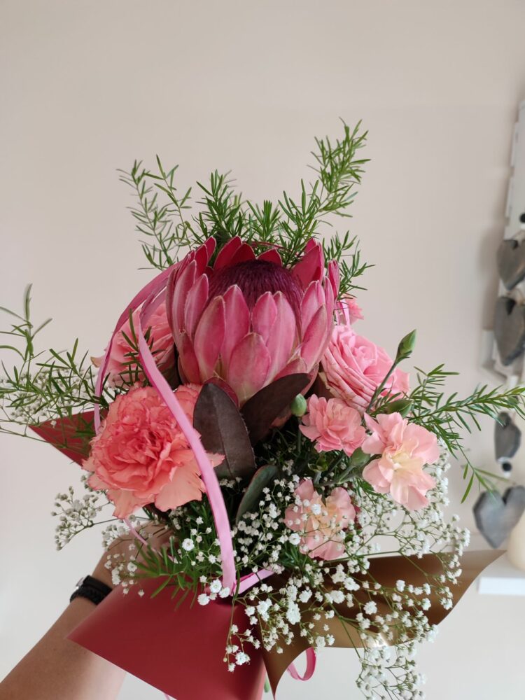 Protea z zielonymi dodatkami, różami i goździkami (wszystko naturalne).