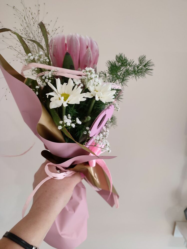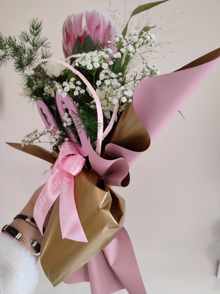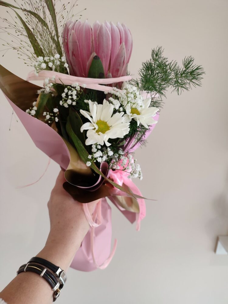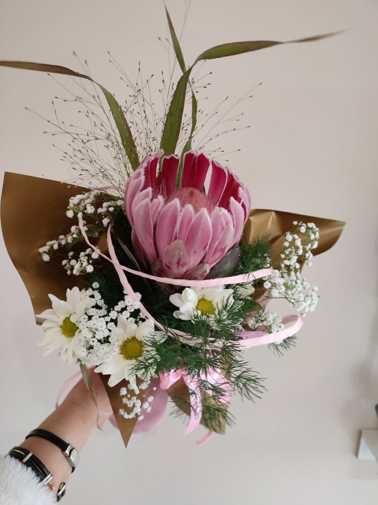 Protea z zielonymi dodatkami i margerytkami (wszystko naturalne).