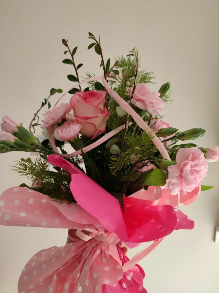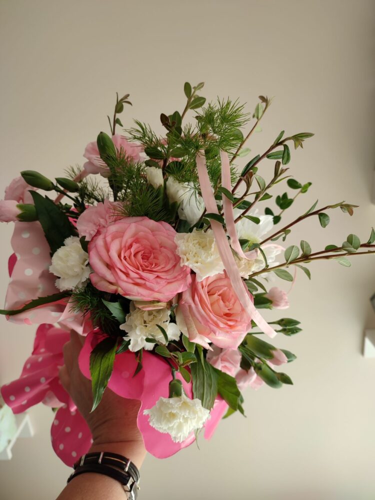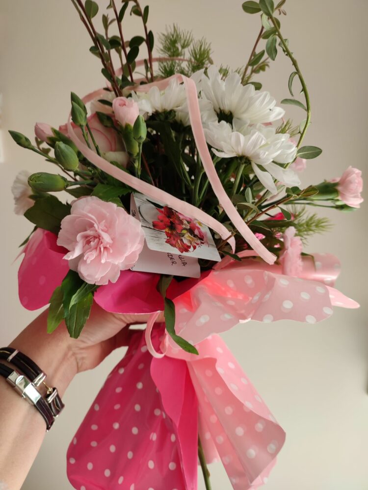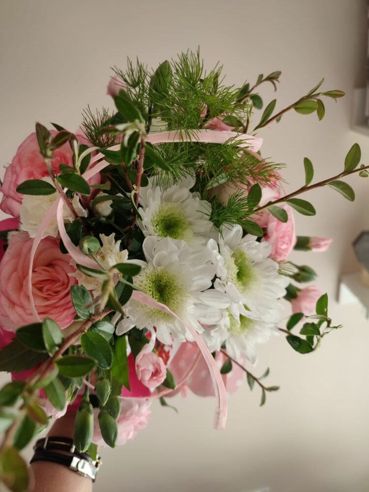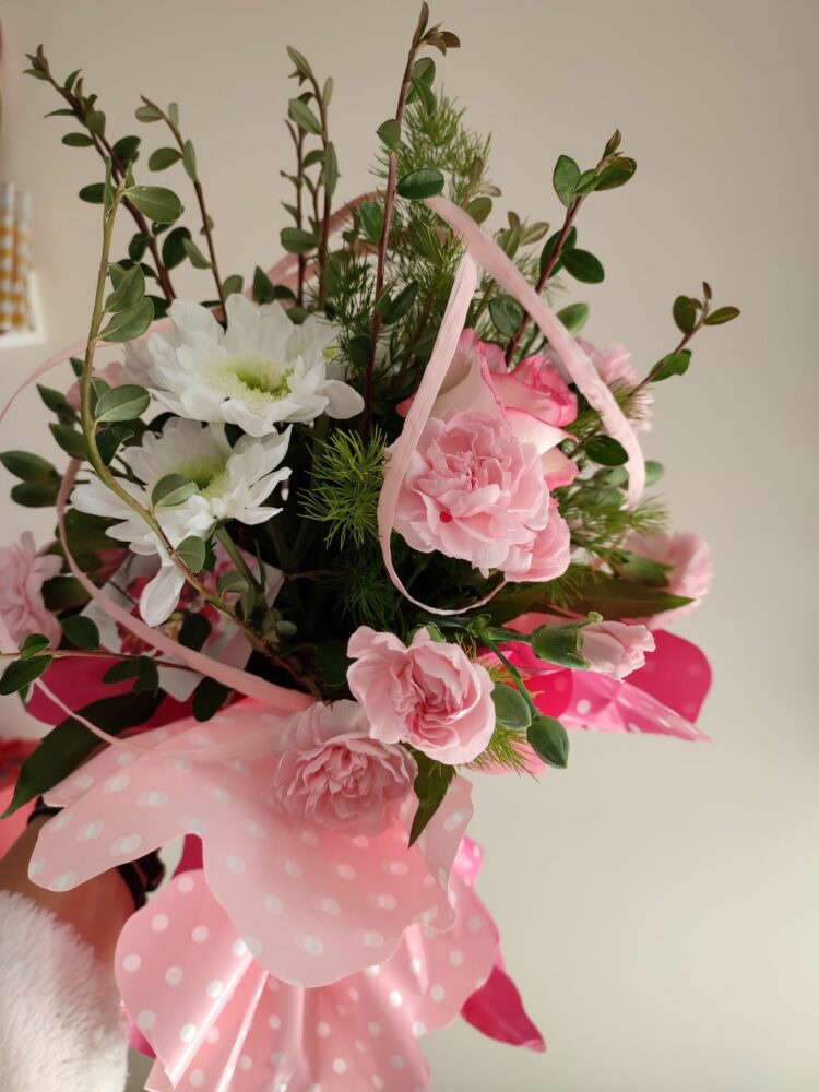 Bukiet /róże, goździki, margaretki /naturalny z przybraniem.
