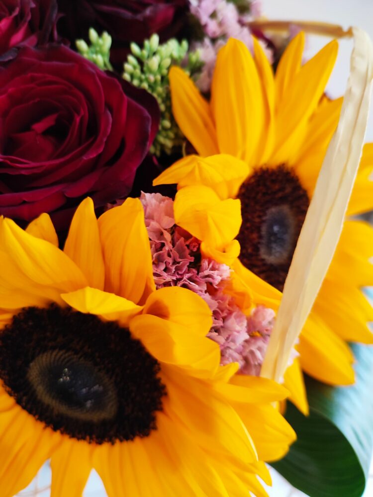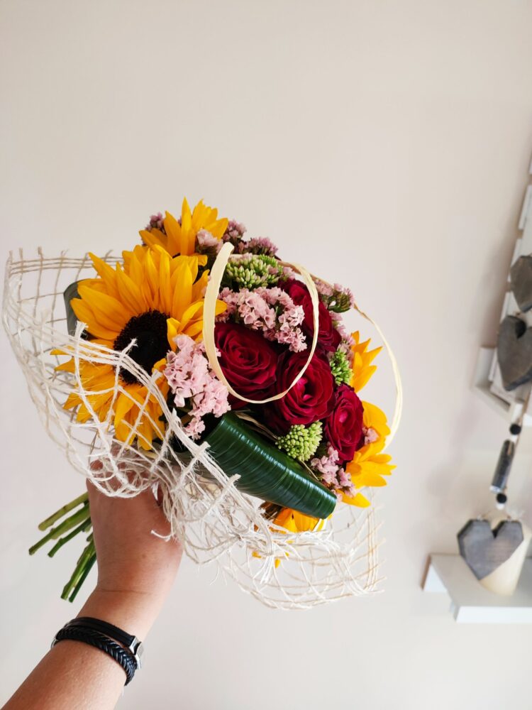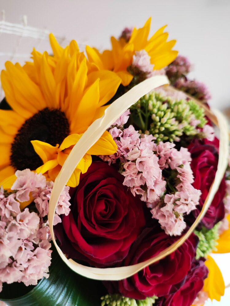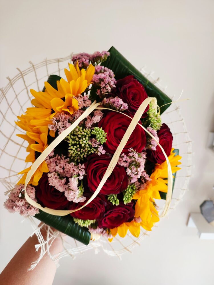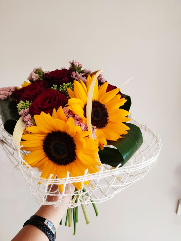 Bukiet róże, słoneczniki, zatrwian /naturalny