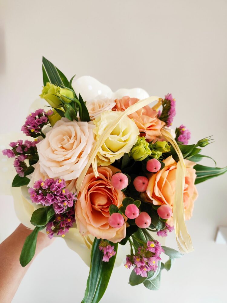 Bukiet róże, zatrwian, eustoma, kawa, lawenda/naturalny