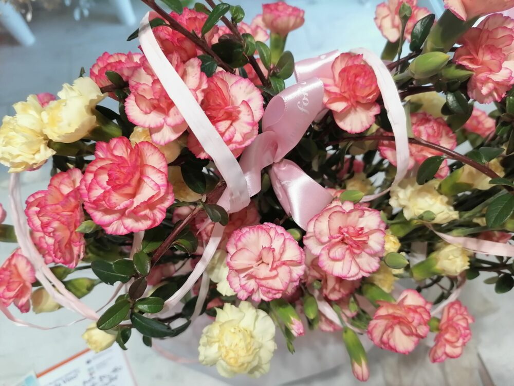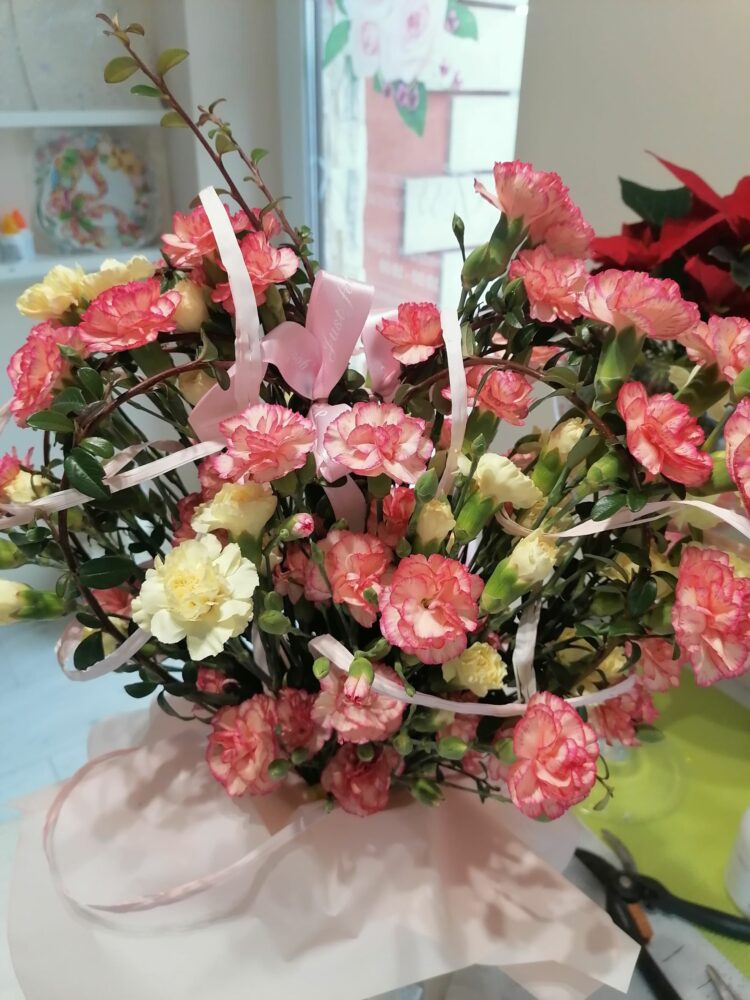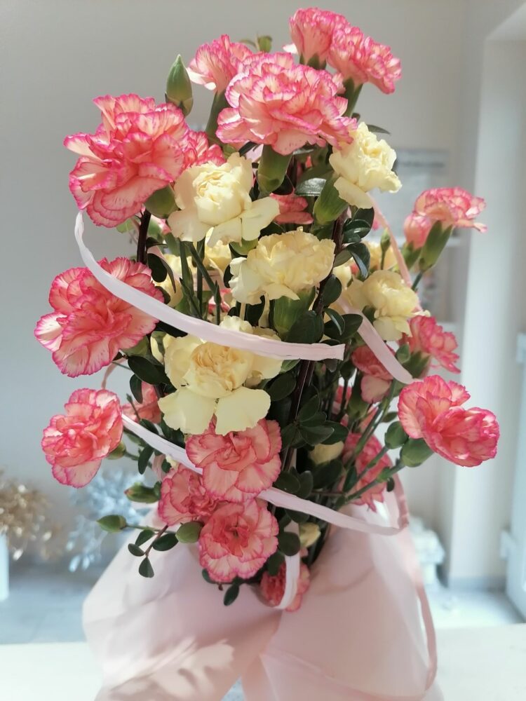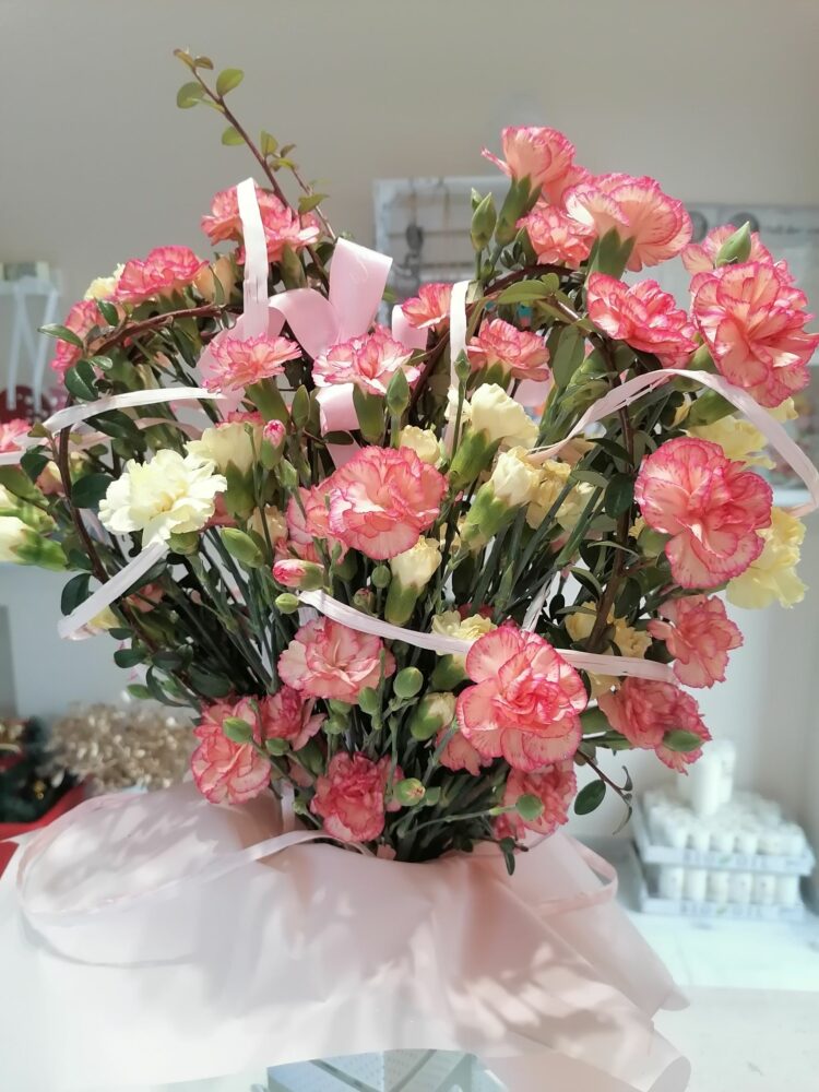 Bukiet w kształcie serca na zamówienie. Wykonany z goździków, na naturalnej kryzie z irgi.