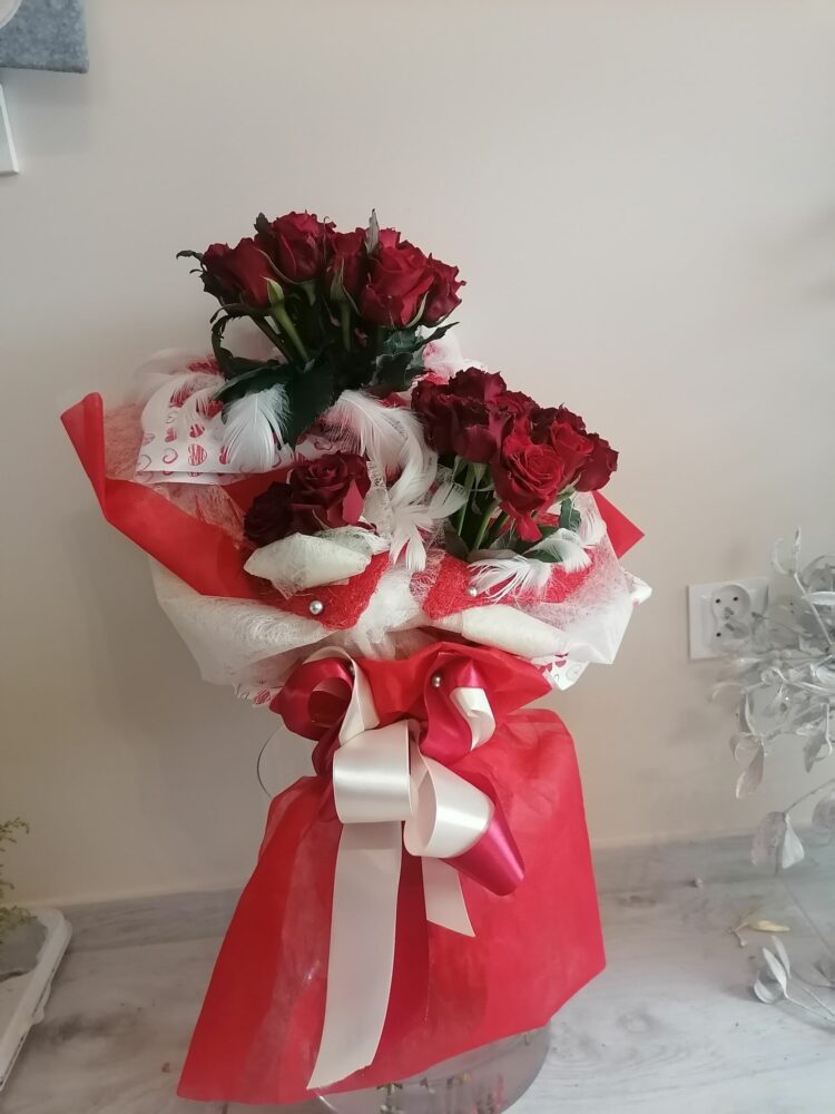 Bukiet zaręczynowy z 50 róż o długości 80 cm, na kryzach ręcznie zdobionych