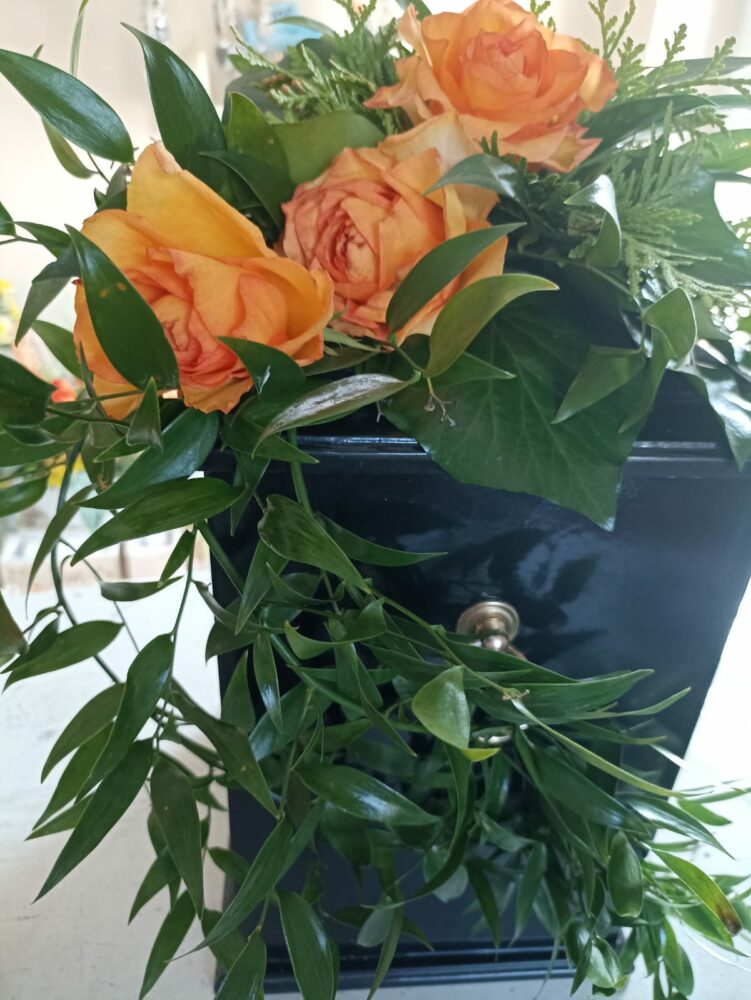 Dekoracja wykonana z kwiatów i roślin naturalnych.