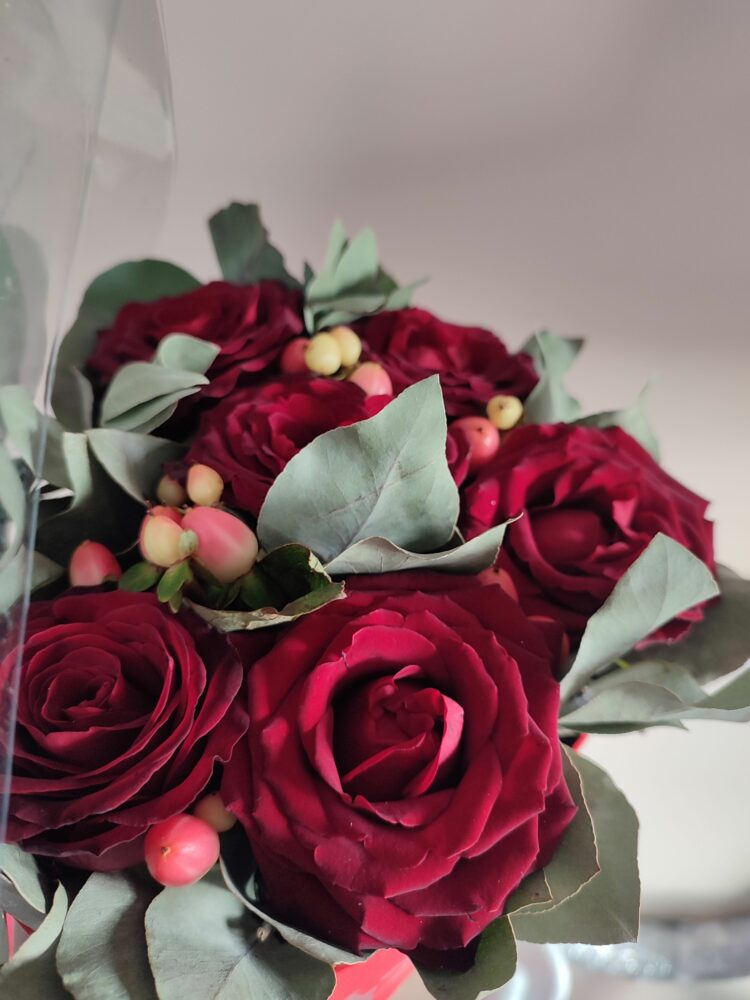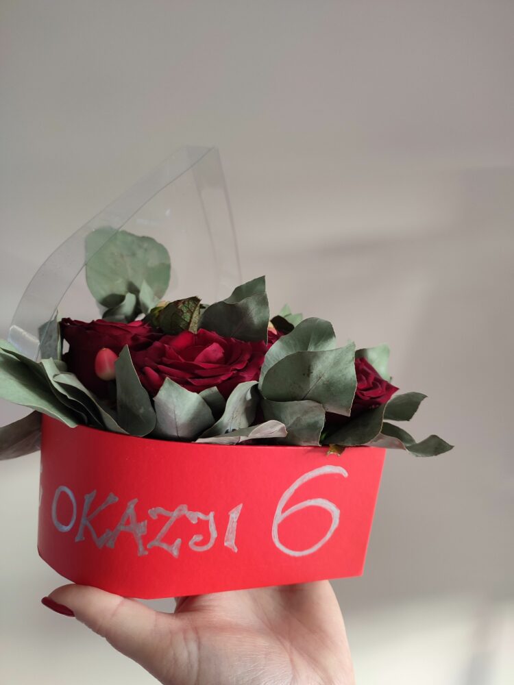 Flower box/otwarte serce /kompozycja naturalna / duże czerwone róże ( 6 szt), kawa, eukaliptus