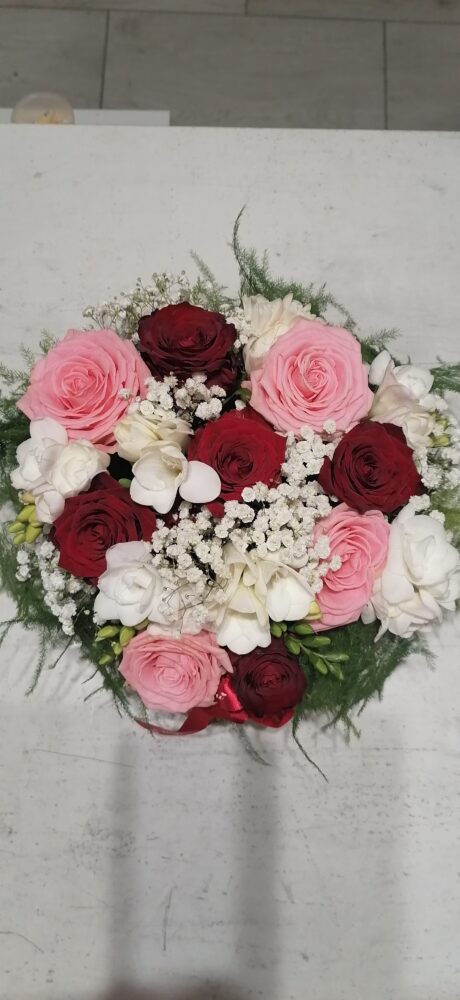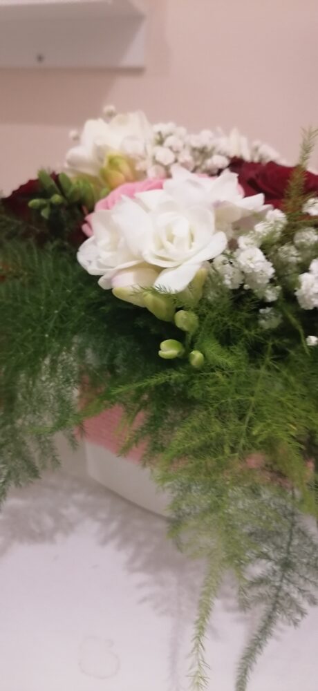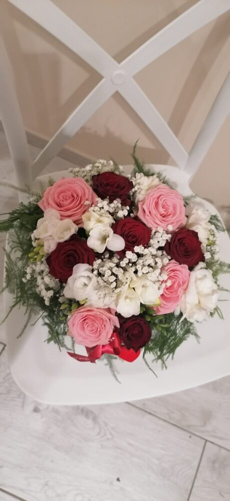 Flower box w kształcie serca, kompozycja z naturalnych róż, frezji i gipsówki. Zdobiona.