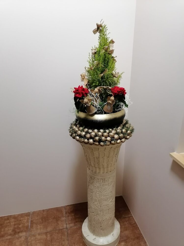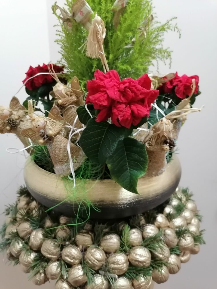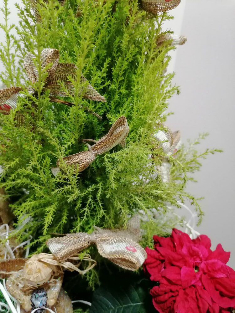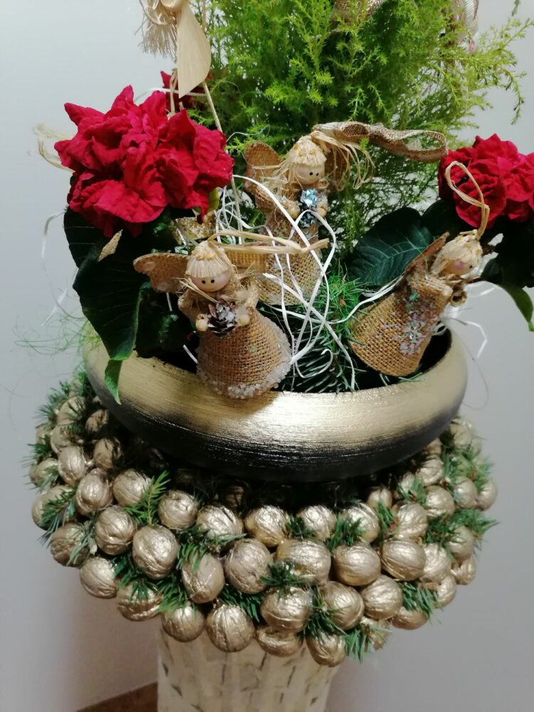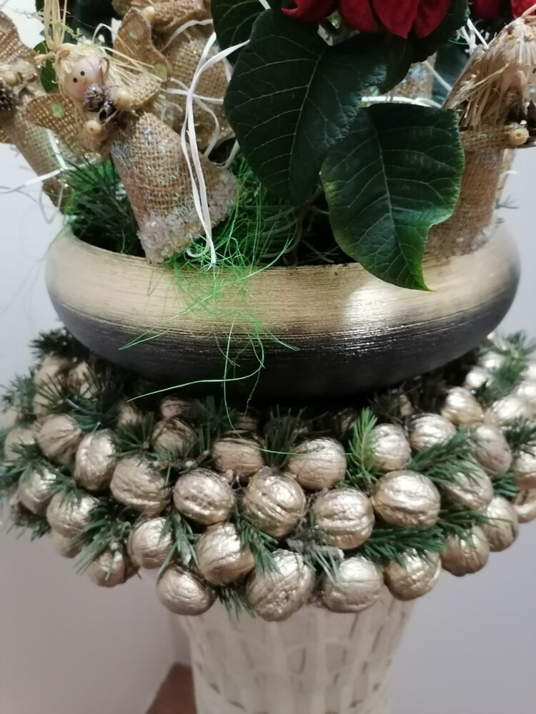 Kompozycja naturalna. Duży cyprys ubrany w kokardy i aniołki z naturalnej juty, umieszczony w ekskluzywnej donicy, otoczony 3-ma gwiazdami betlejemskimi (naturalnymi, o rzadko spotykanym pokroju kwiatów).Całość umieszczona w ręcznie robionym, bardzo dużym wianku z naturalnych orzechów włoskich farbowanych na złoty kolor. Do postawienia w dowolnym miejscu . W cenę nie wliczono kolumny, na której umieszczono dekorację.