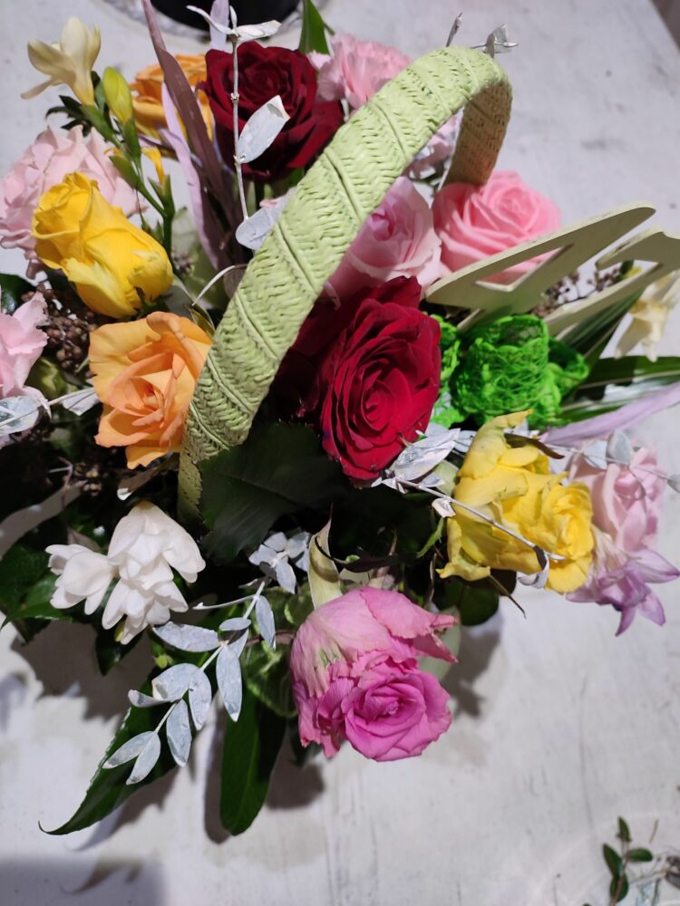 Kompozycja w koszu /naturalna / róże, goździki, zieleń dekoracyjna. Kosz ręcznie zdobiony.