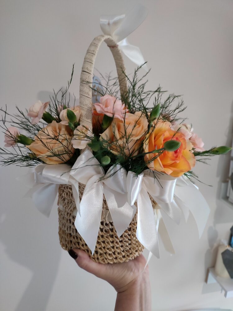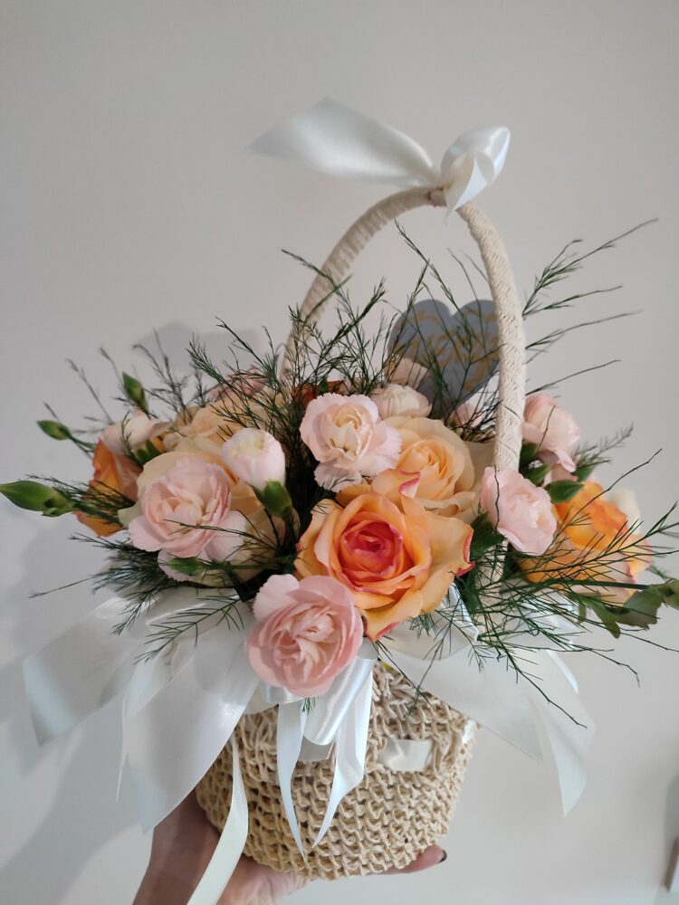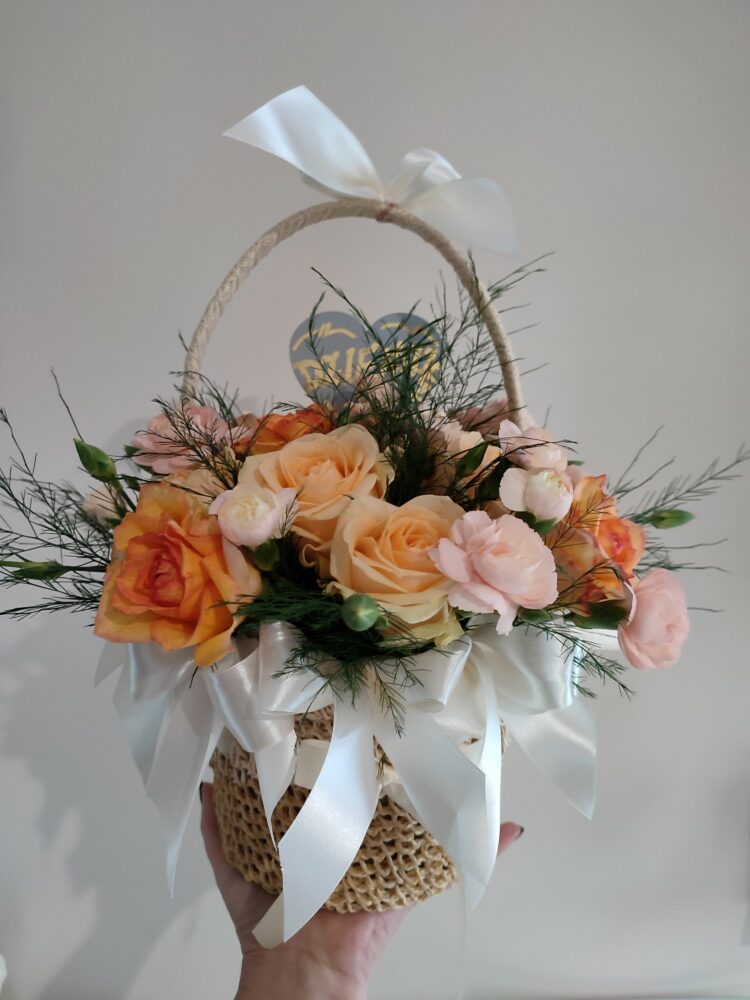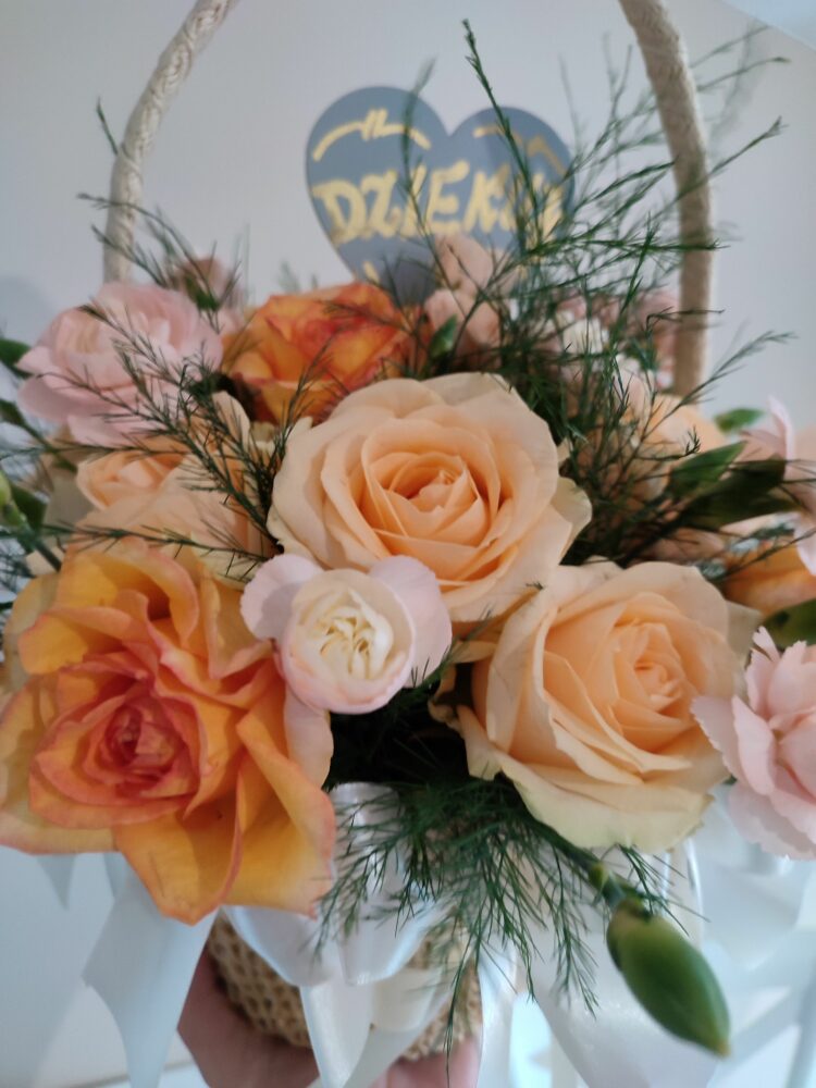 Kompozycja w koszu /naturalna / róże, goździki, zieleń dekoracyjna. Kosz ręcznie zdobiony.