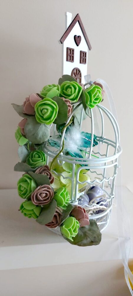 Motylki w klatce/kompozycja ręcznie robiona. Może stanowić dekorację o każdej porze roku i na każdą okazję. Jest ozdobą stojącą i wiszącą.