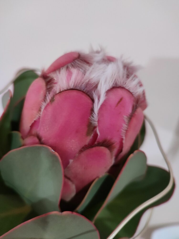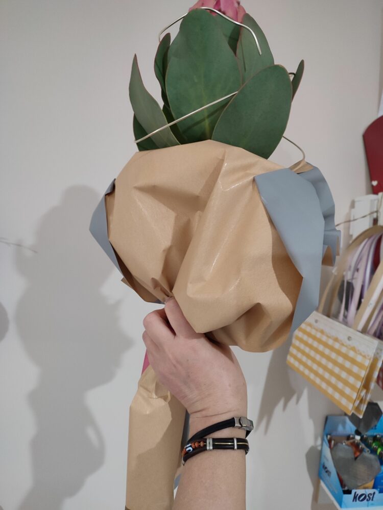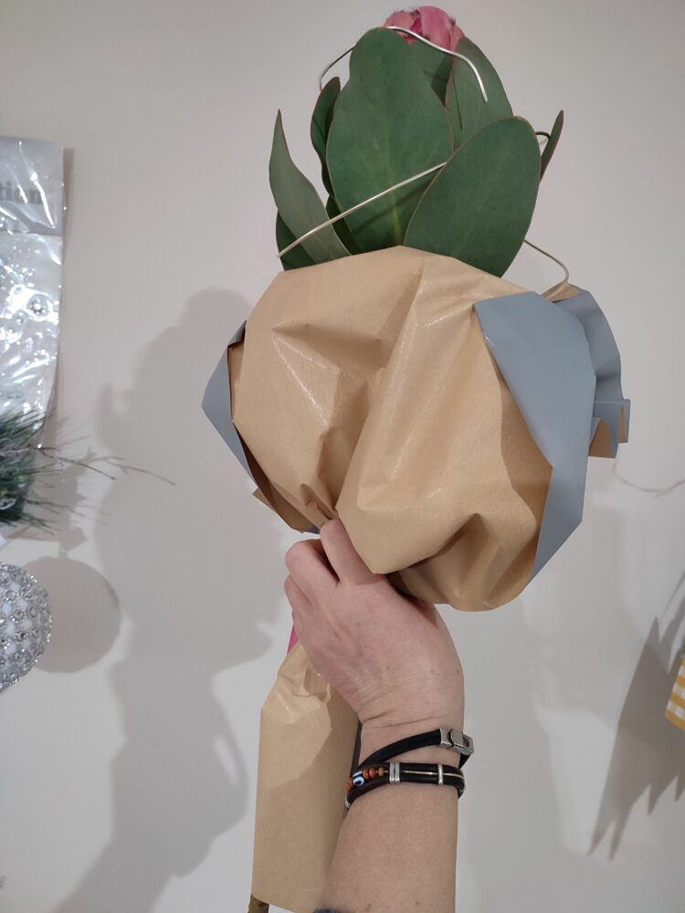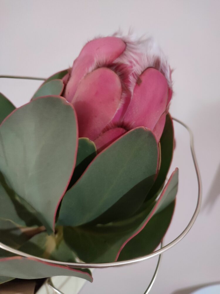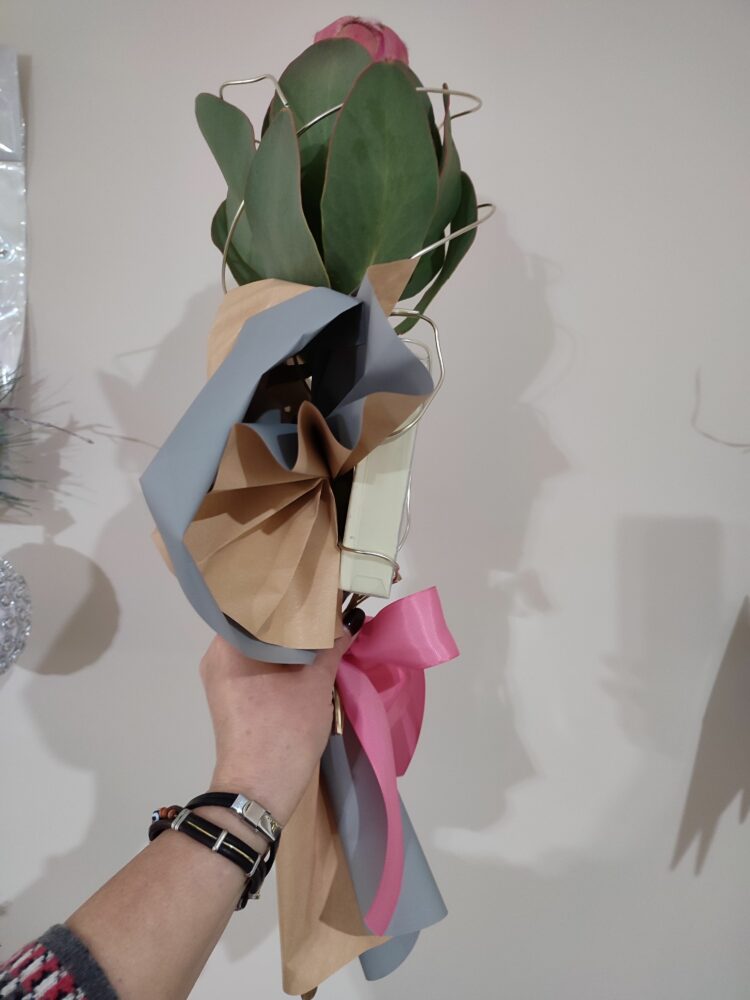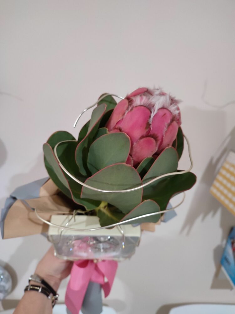 Żywy kwiat Protea i wkomponowana w tą dekorację podkowa z masy perłowej – idealny prezent.