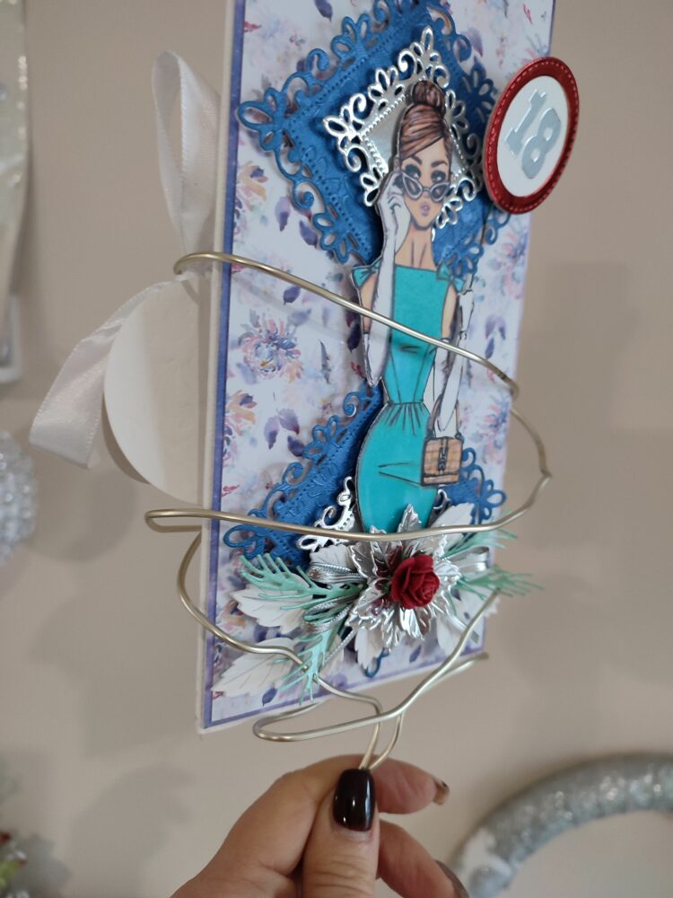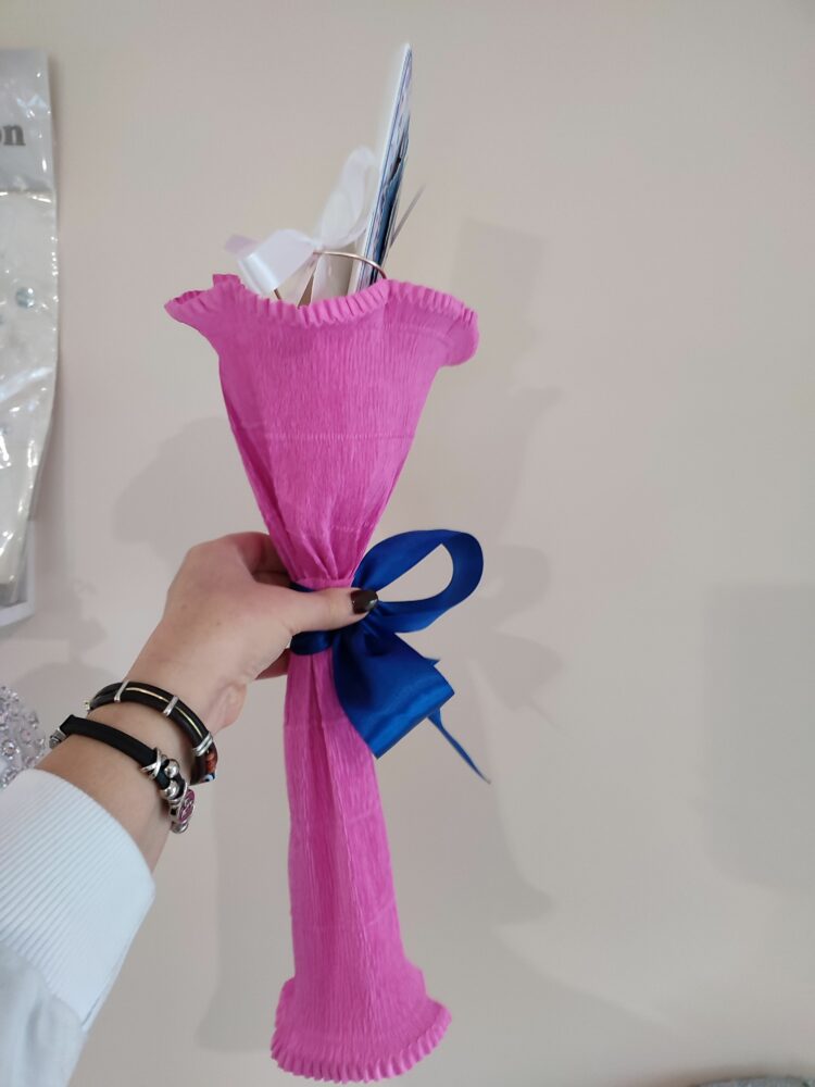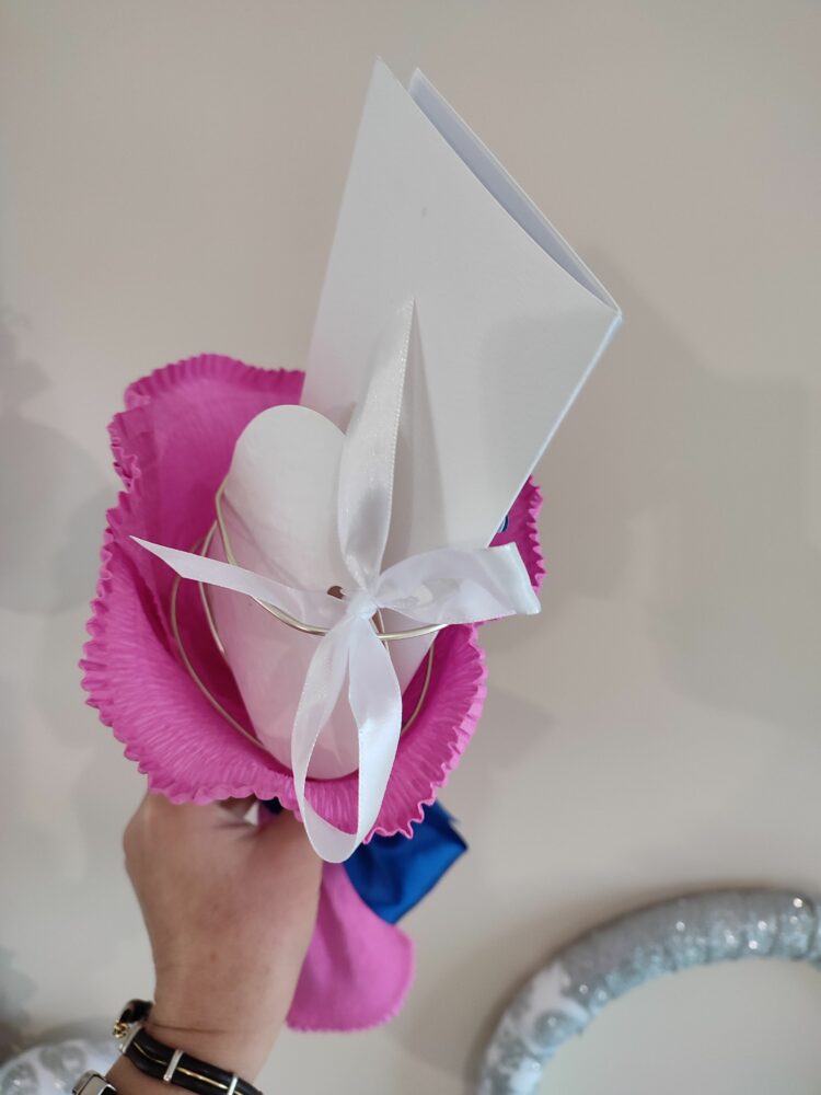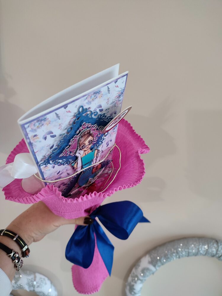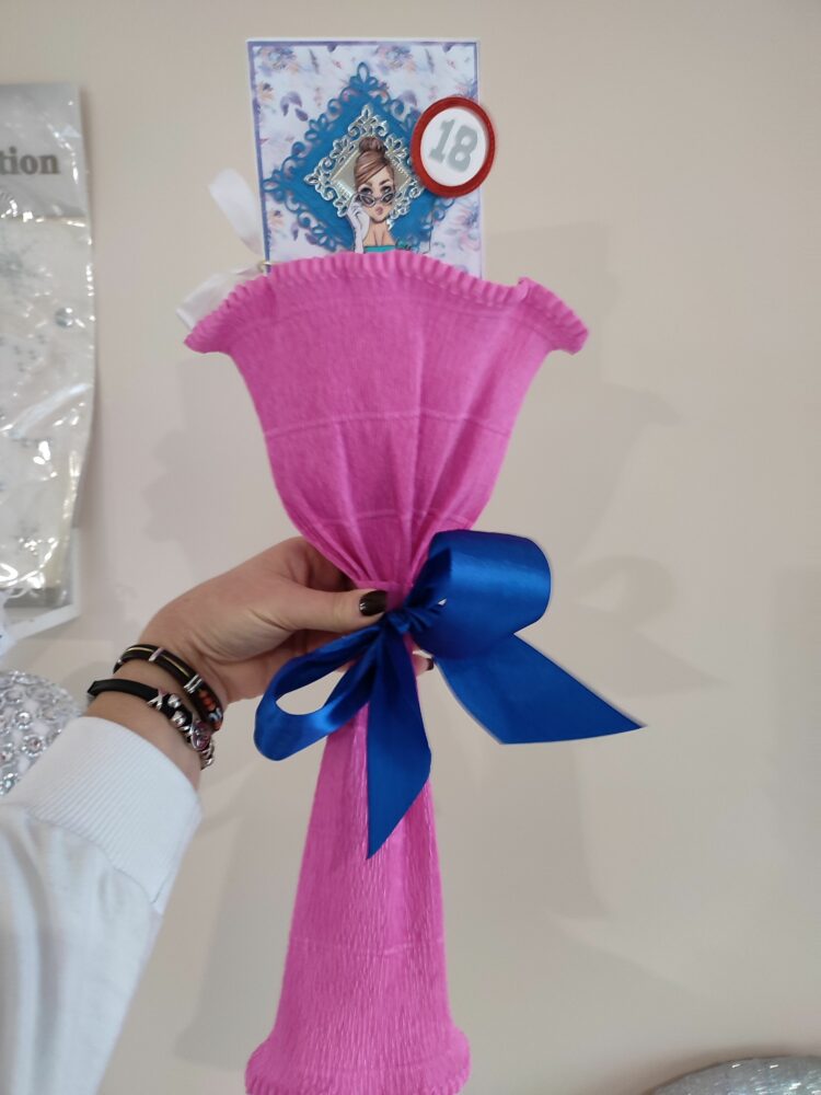 Do tego zestawu dołączono -oddzielnie spakowaną w formie bukietu- ręcznie robioną kartkę urodzinową oraz serduszko z pieniędzmi.