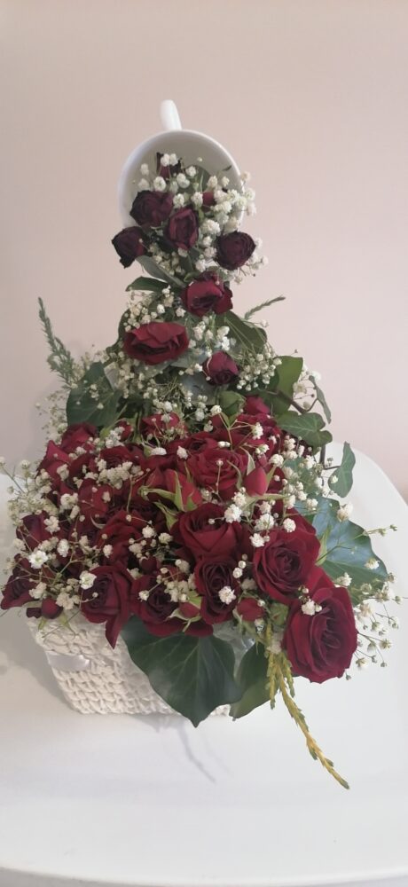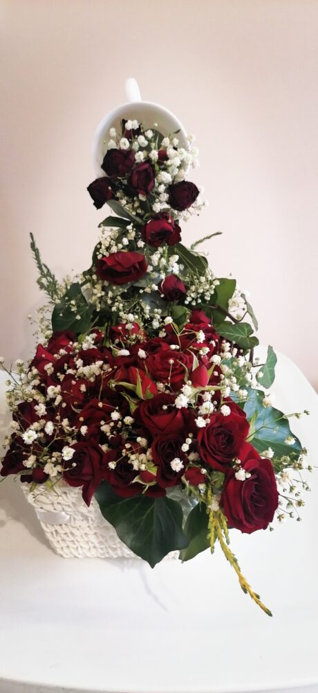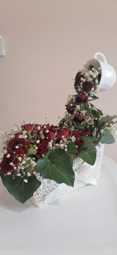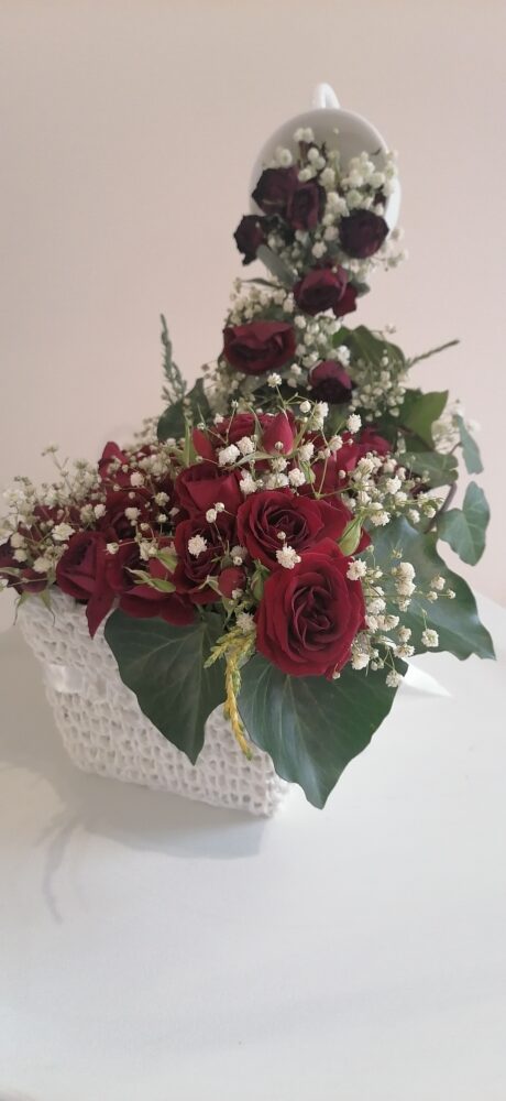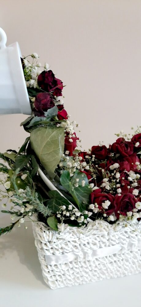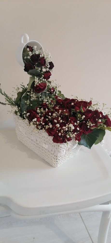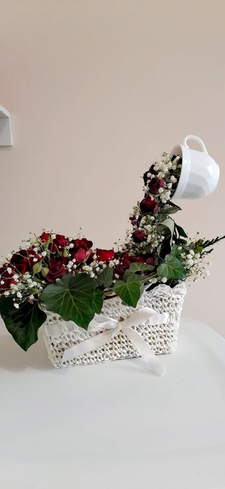 Kompozycja naturalna. Róże wypływają z porcelanowej filiżanki i wpływają do koszyka tworząc zagłębienie, następnie się spiętrzają i wypływają z koszyka.