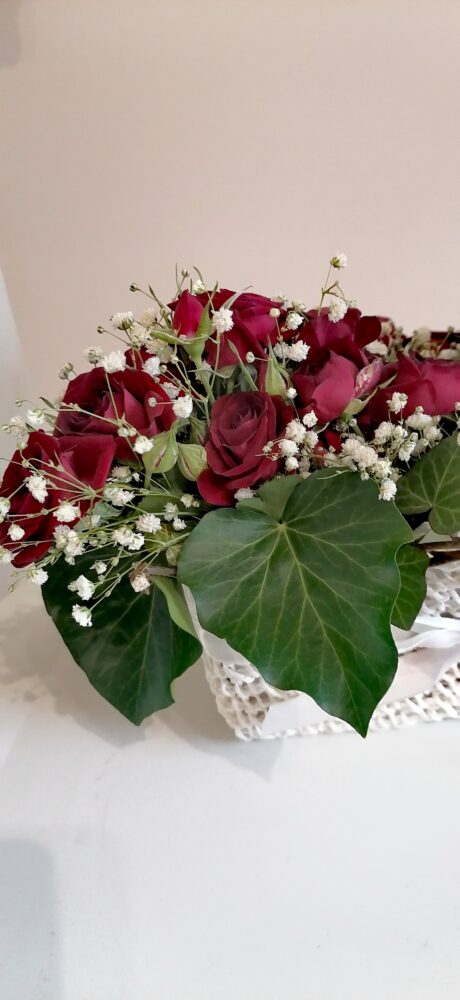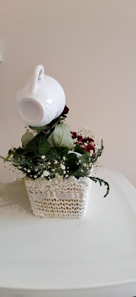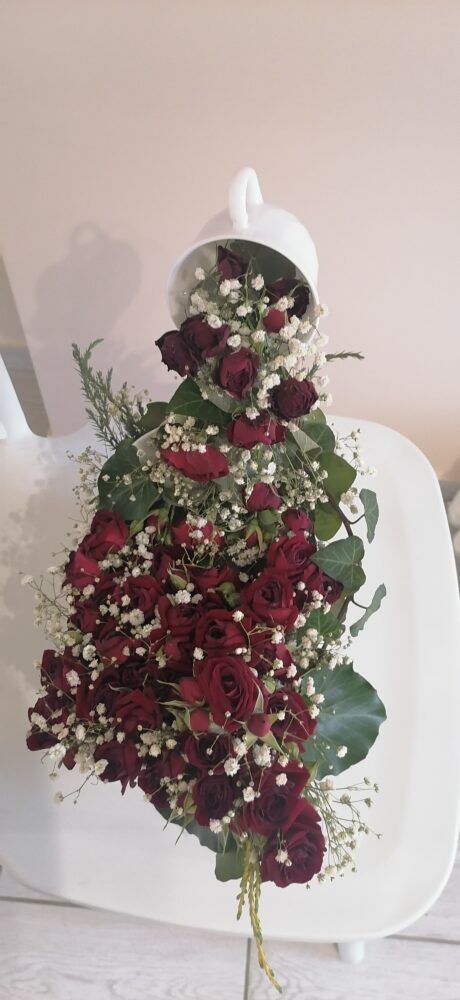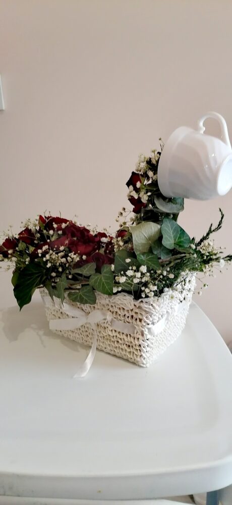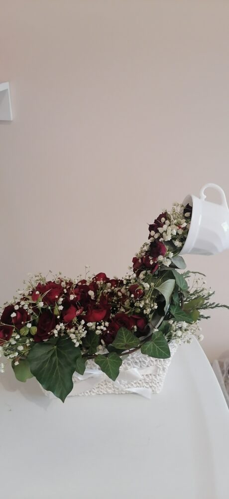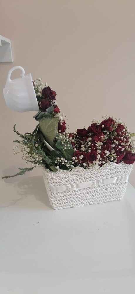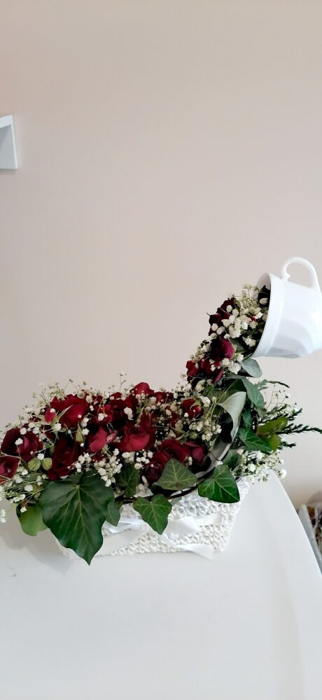 Kompozycja naturalna. Róże wypływają z porcelanowej filiżanki i wpływają do koszyka tworząc zagłębienie, następnie się spiętrzają i wypływają z koszyka.