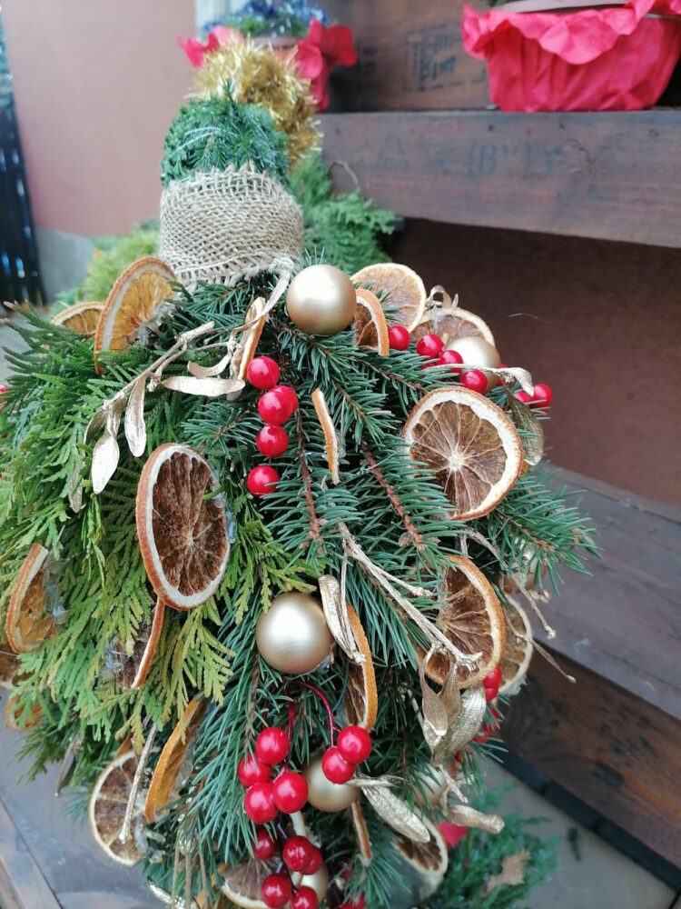 Stroik wykonany ręcznie , z naturalnych gałązek, z naturalnymi pomarańczami, na naturalnym pniu z wierzby mandżurskiej. Choinka może stać na zewnątrz.
