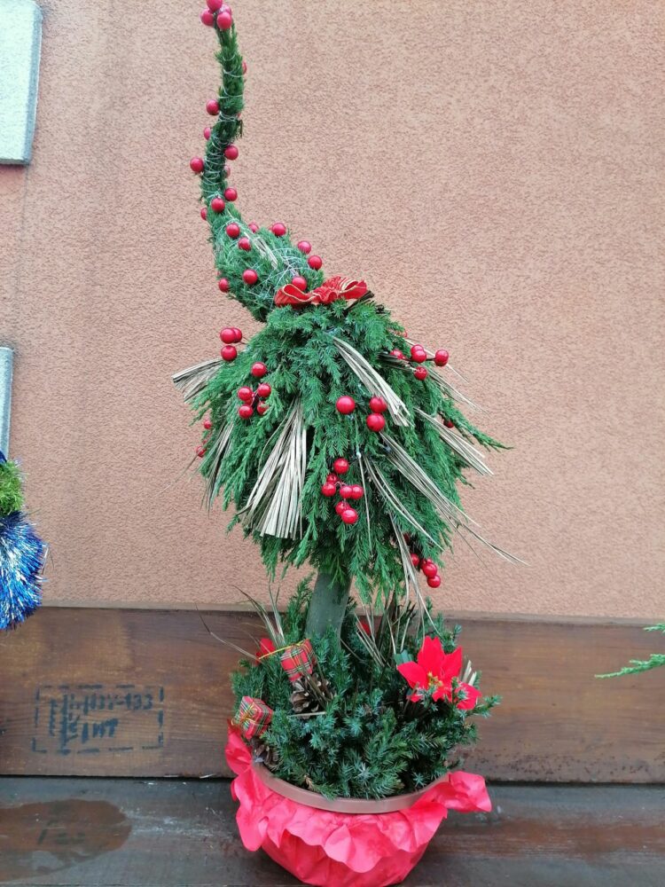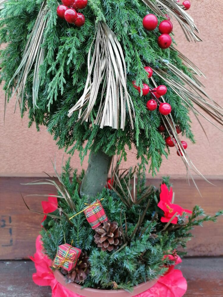 Stroik wykonany ręcznie , z naturalnych gałązek, na naturalnym pniu z wierzby mandżurskiej. Choinka może stać na zewnątrz.