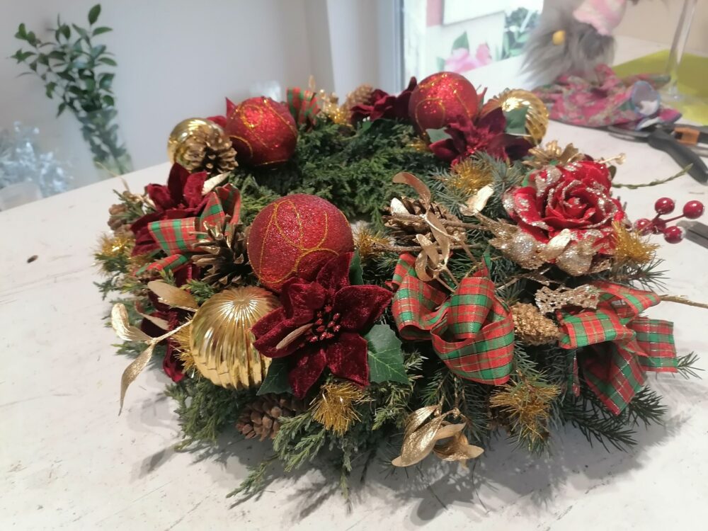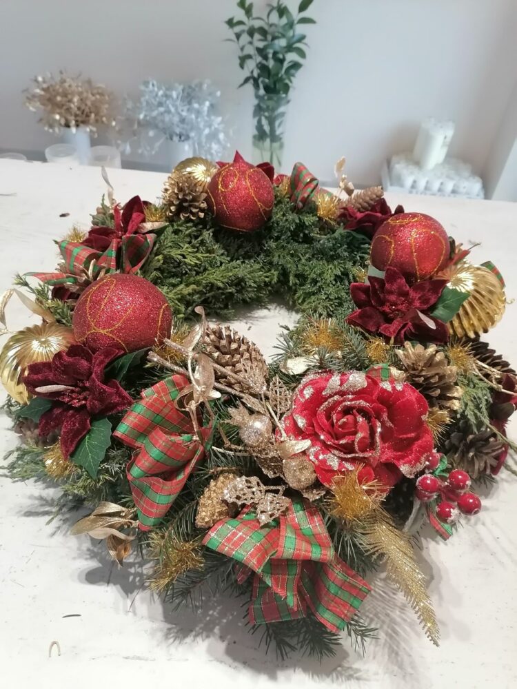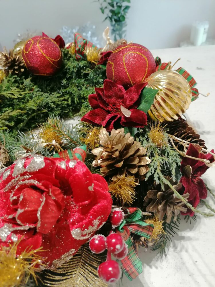 Stroik bożonarodzeniowy/wianek z naturalnej choiny. Ręcznie zdobiony. Może stanowić dekorację każdego miejsca. W tym przypadku został przeznaczony jako dekoracja dużego znicza na cmentarz.