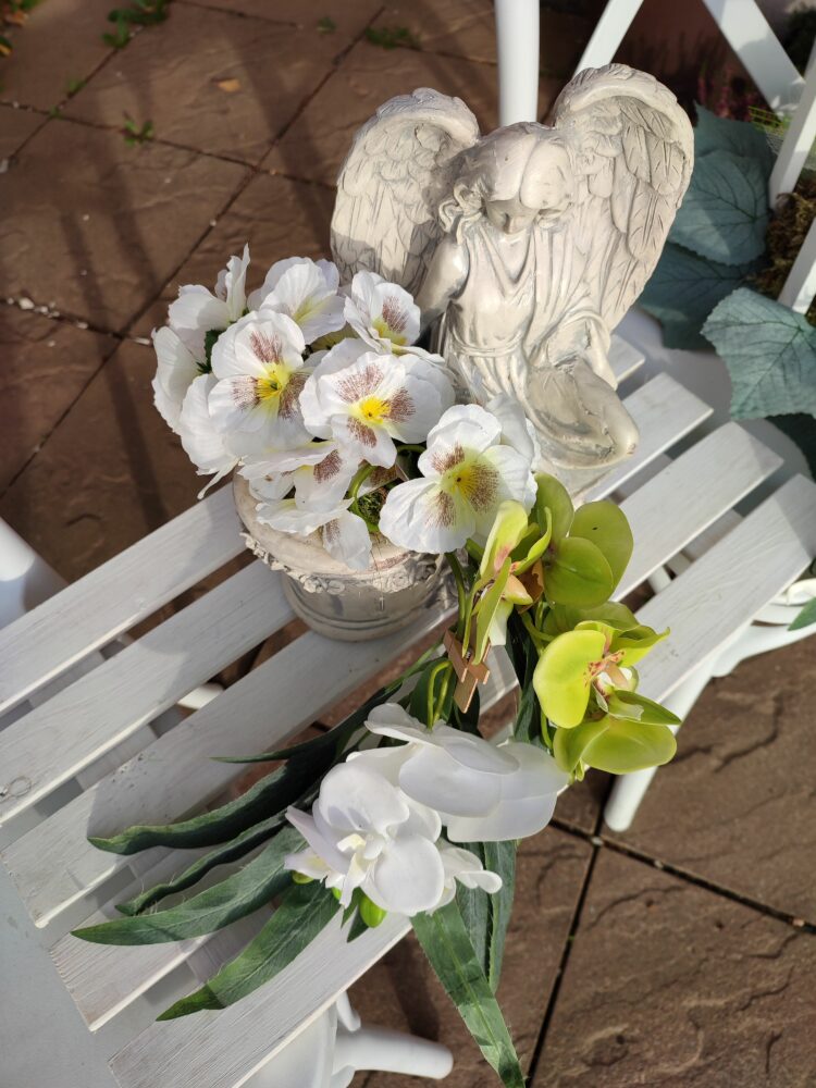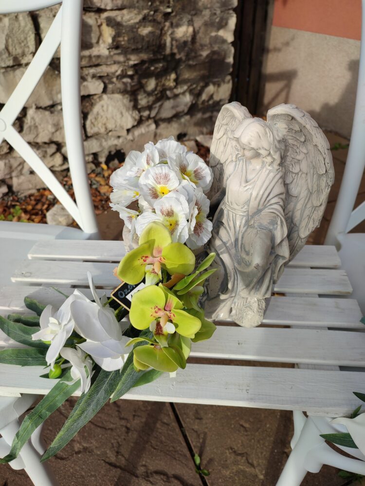 Stroik na cmentarz / Anioł gipsowy donica i wypływające z niej (z naturalnego mchu) kwiaty.