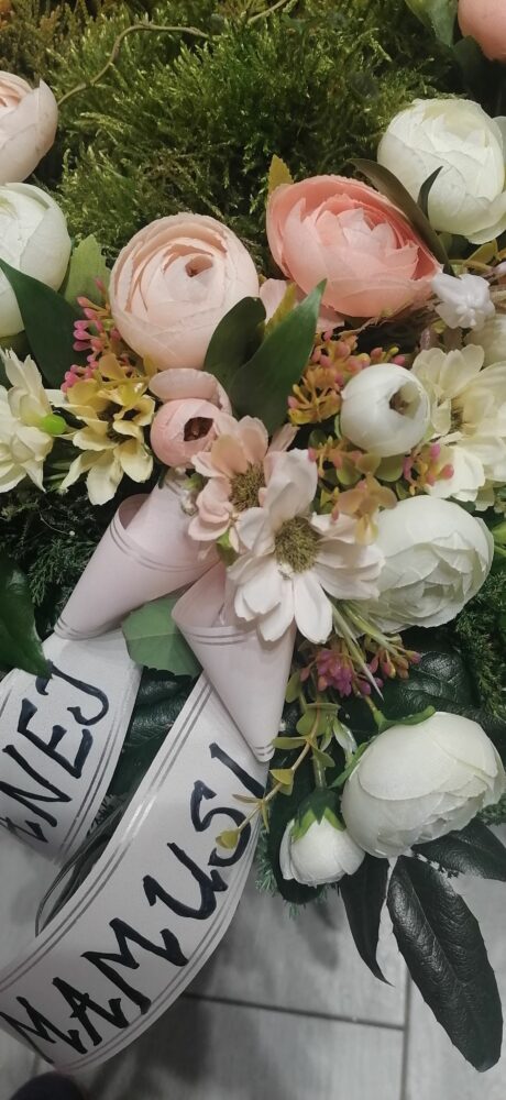 Dekoracja jest stabilna, na naturalnym podkładzie ułożono sztuczne kwiaty.