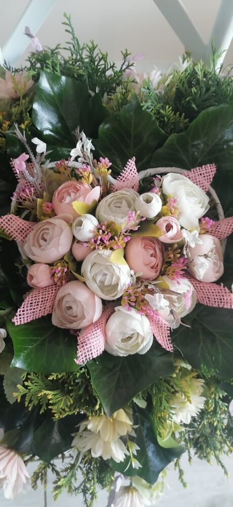 Dekoracja jest stabilna, na naturalnym podkładzie ułożono sztuczne kwiaty.