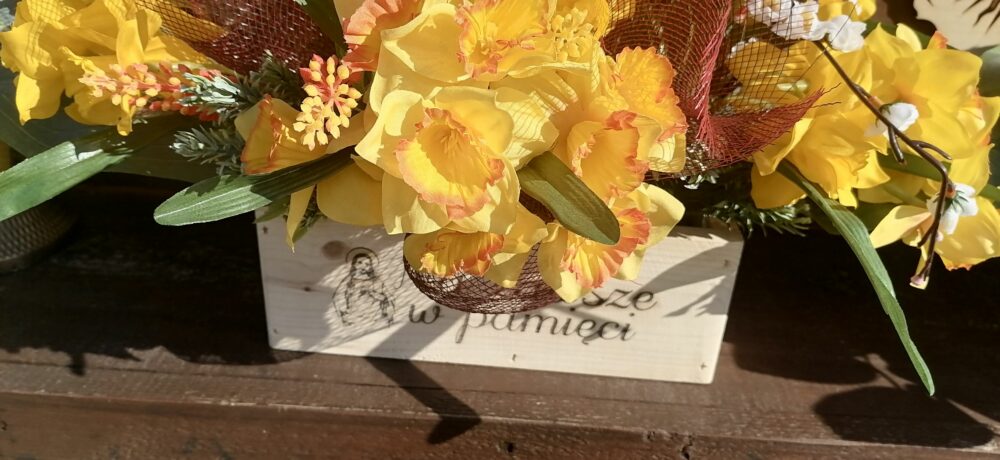 Dekoracja jest stabilna, sztuczna, w skrzynce z drewna naturalnego.
