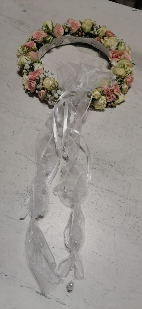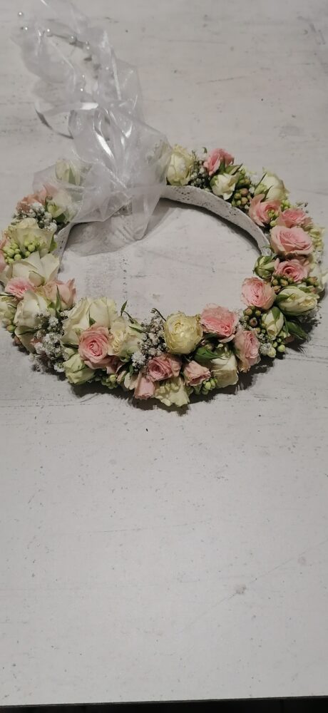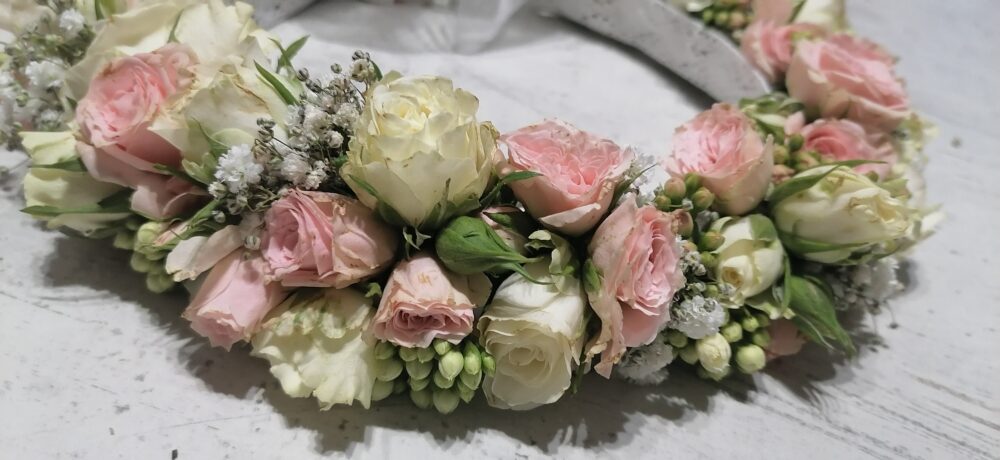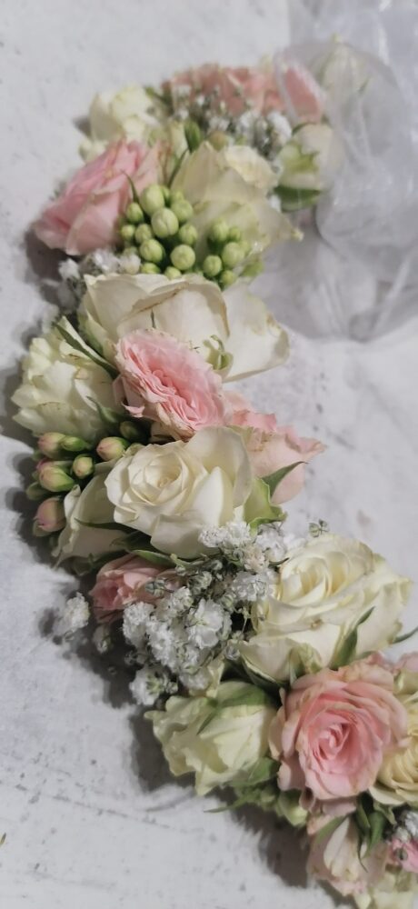 Wianek z żywych kwiatów, robiony na miarę, gęsto pleciony dzięki czemu jest trwalszy. Nasze wianki długo utrzymują świeżość.