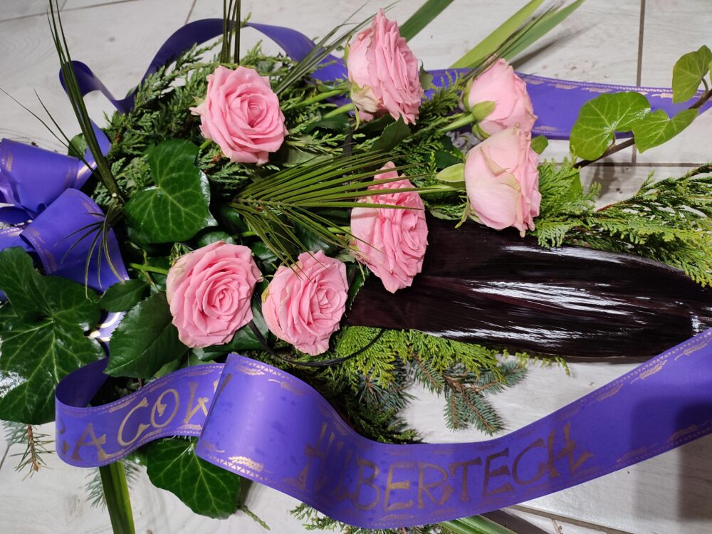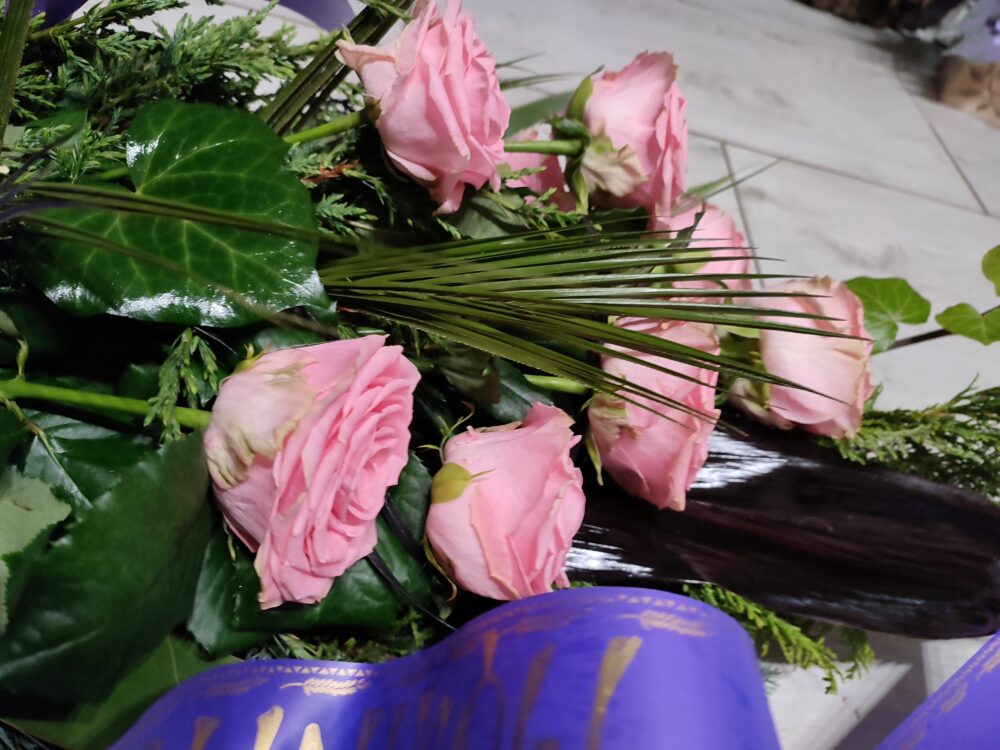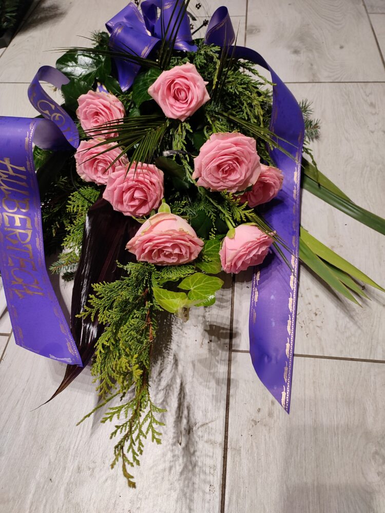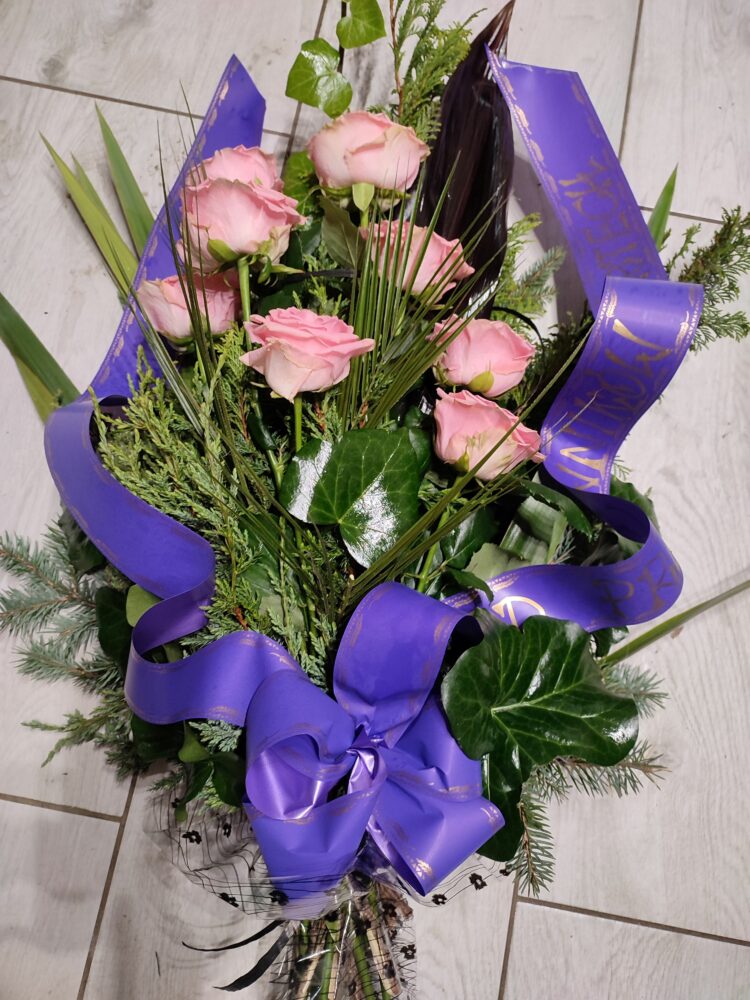 Wiązanka pogrzebowa/naturalne kwiaty- różowe róże, naturalna zieleń