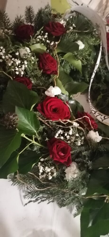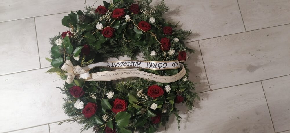 Wieniec pogrzebowy, naturalny, róże , gożdziki, gipsówka
