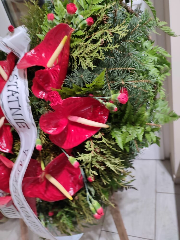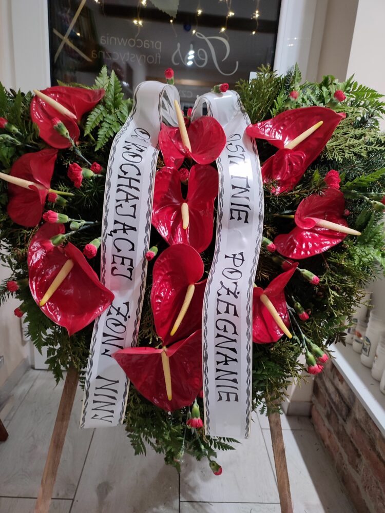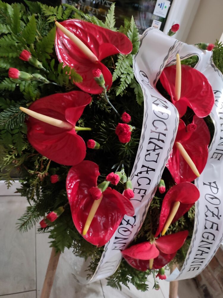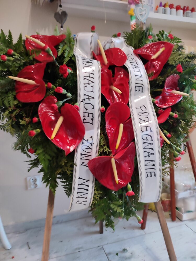 Napisz pierwszą opinię o “Wieniec pogrzebowy na stojaku/ naturalny /kształt serca/czerwone anturium, goździki/duży”